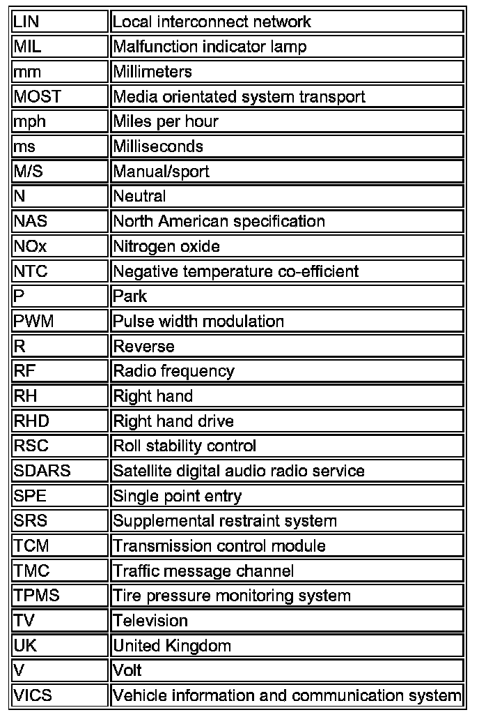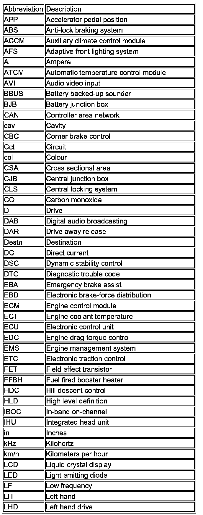 The following list contains wire colour codes used on the vehicle harnesses.