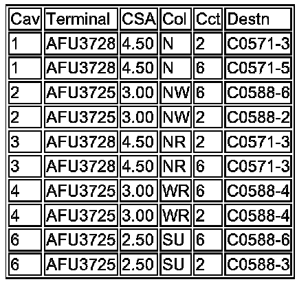 - Wire Chart (Pin-out table) - A six column table, giving details of each wire within the connector: