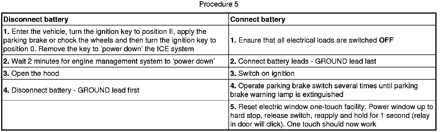 CAUTION: The vehicle status and battery condition must be established before attempting battery disconnect/connect. Reference must be then made to the following table to establish the relevant procedure to be followed.