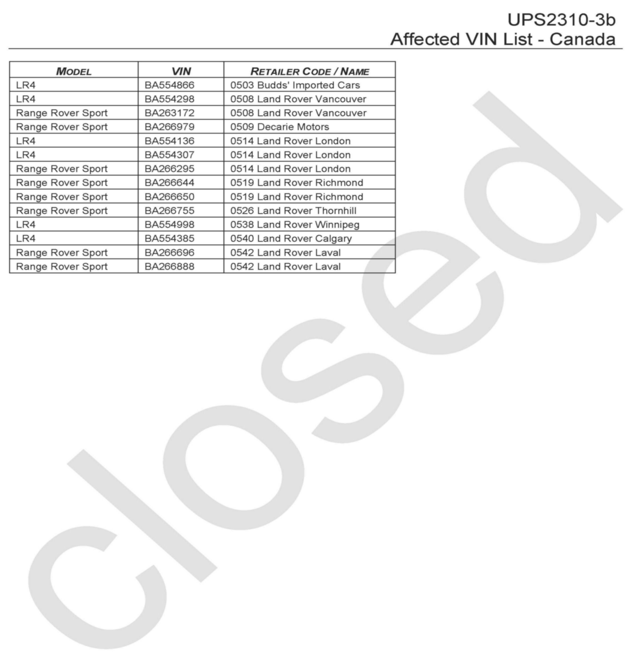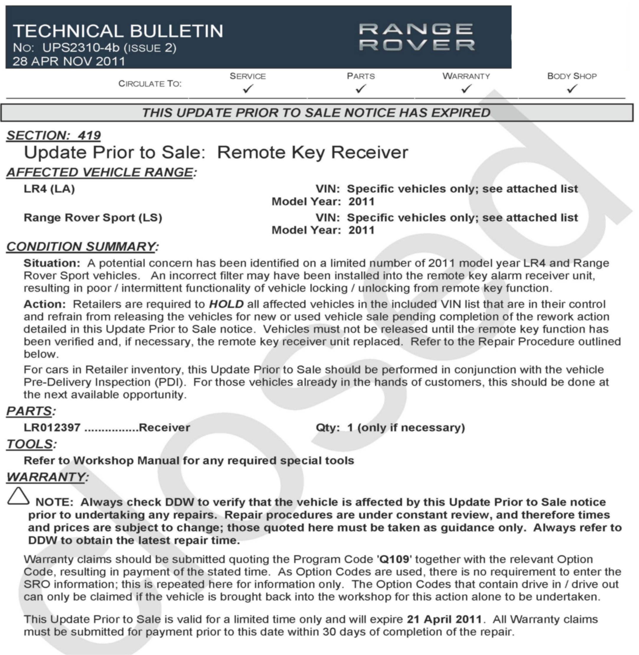 Update Prior to Sale Notice UPS2310 is closed effective 21 April 2011