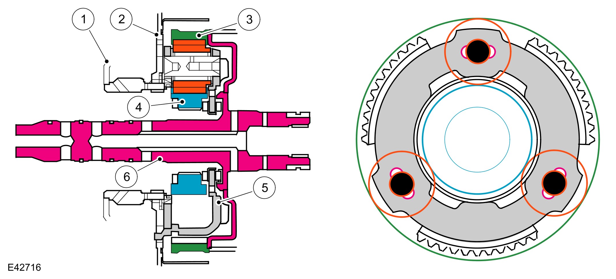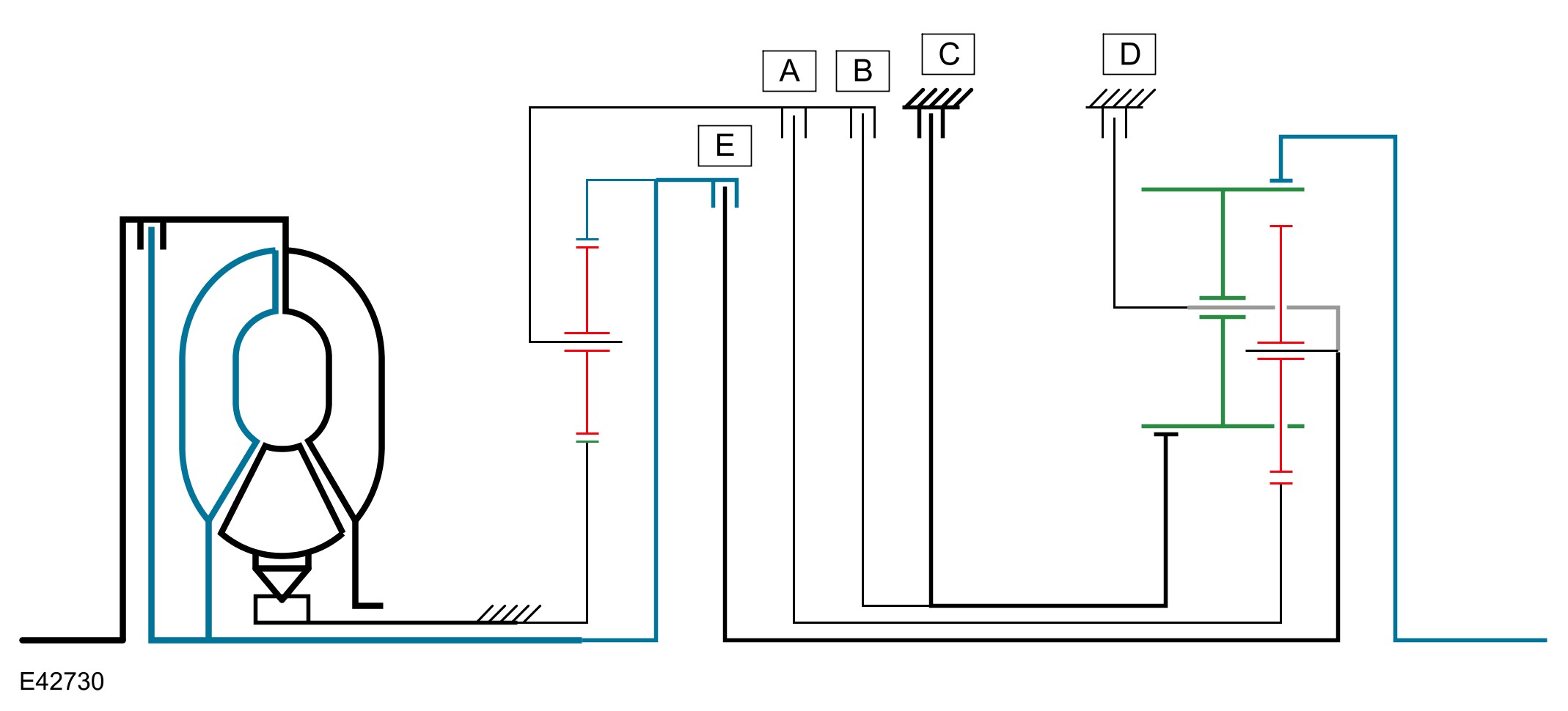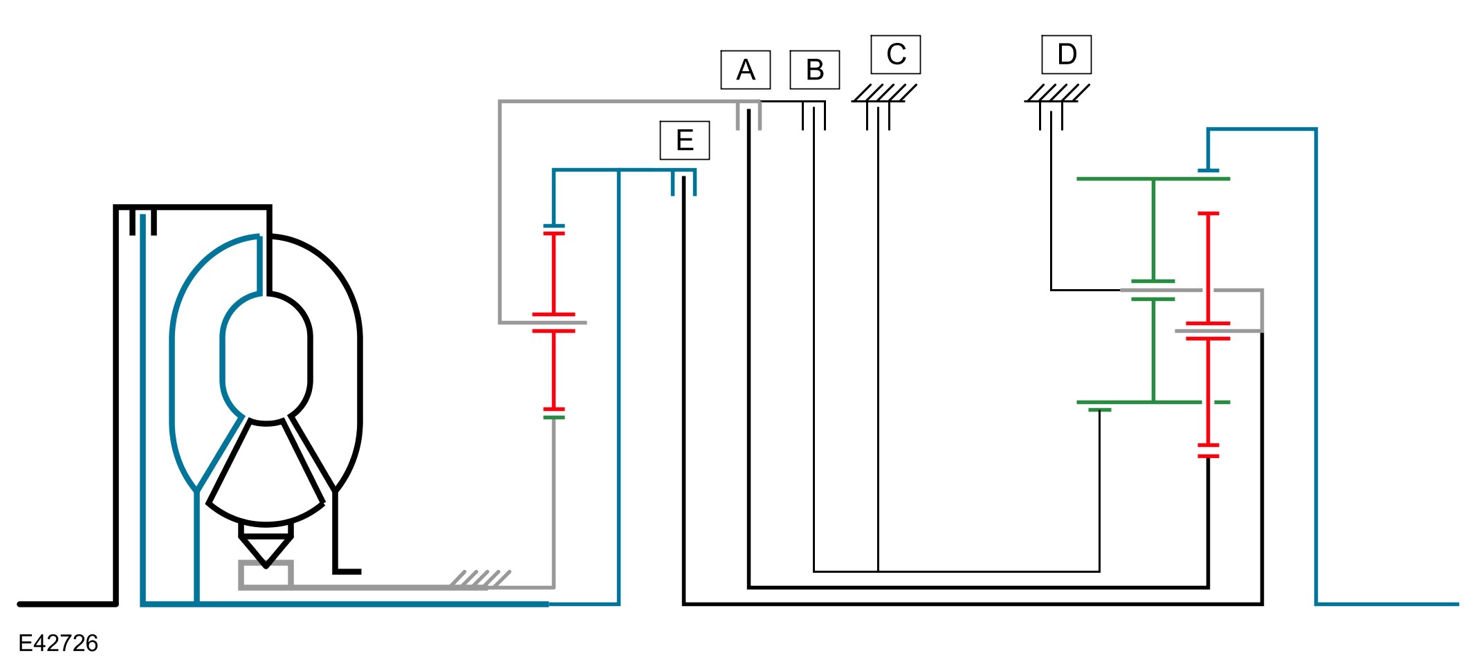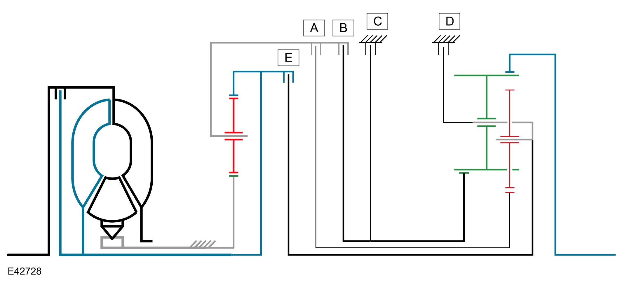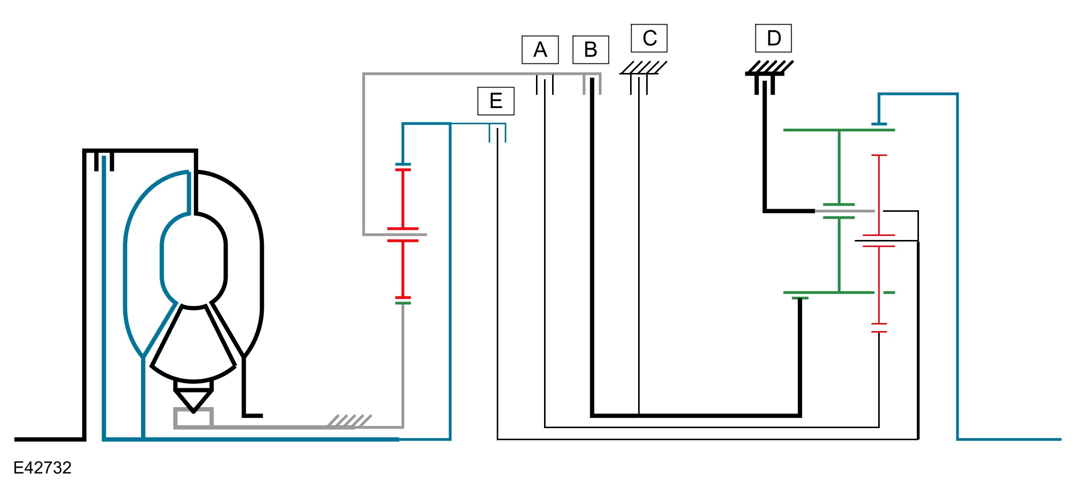 The shift elements are three rotating multiplate clutches (A, B and E) and two fixed multiplate brakes (C) and D). All shifts from 1st to 6th gears are power-on overlapping shifts. Overlapping shifts can be described as one of the clutches continuing to transmit drive at a lower main pressure until the next required clutch is able to accept the input torque.