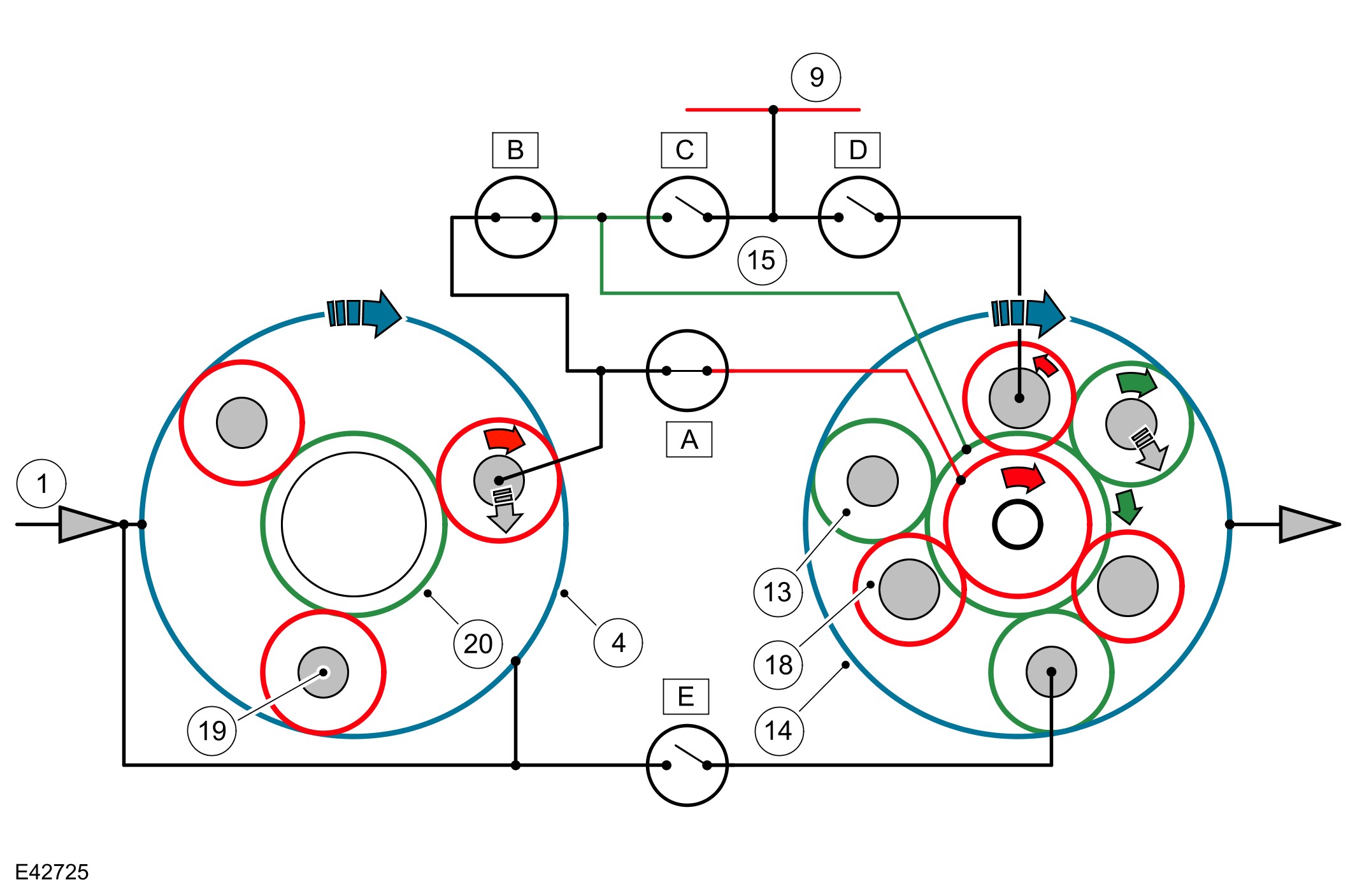 The selector lever and the selector spool valve are in the 'R' position. Engine torque is transmitted from the torque converter turbine shaft to ring gear 1 of the single web planetary gear train and the outer plate carrier of clutch 'E'.