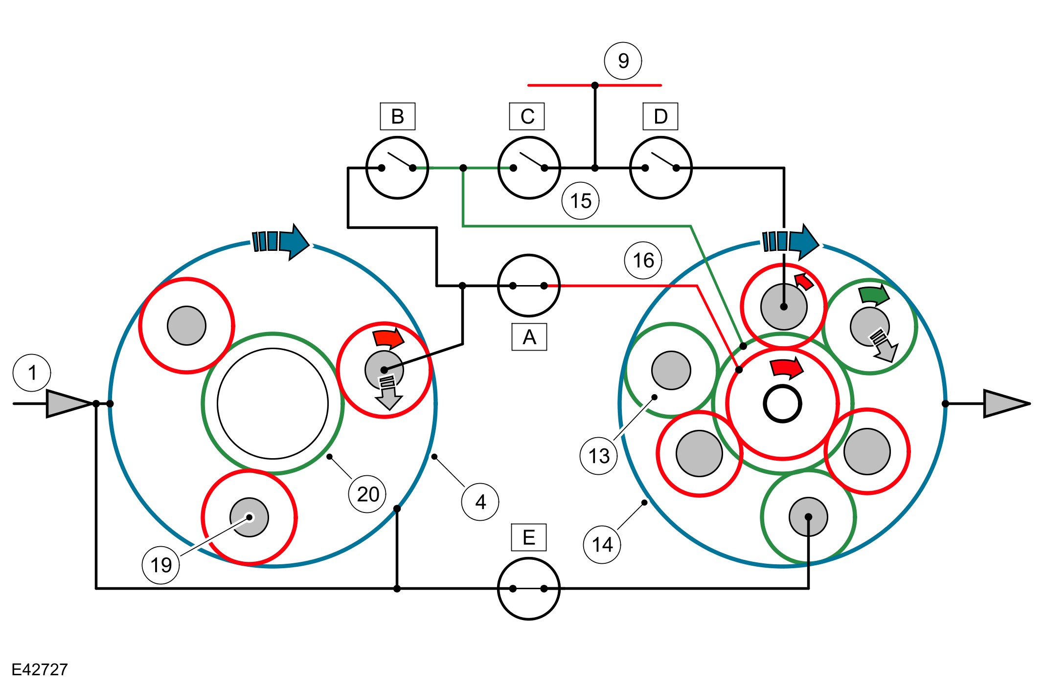 The selector lever and the selector spool valve are in the 'D' position. Engine torque is transmitted from the torque converter turbine shaft to ring gear 1 of the single web planetary gear train and the outer plate carrier of clutch 'E'.