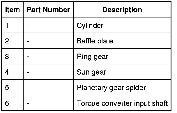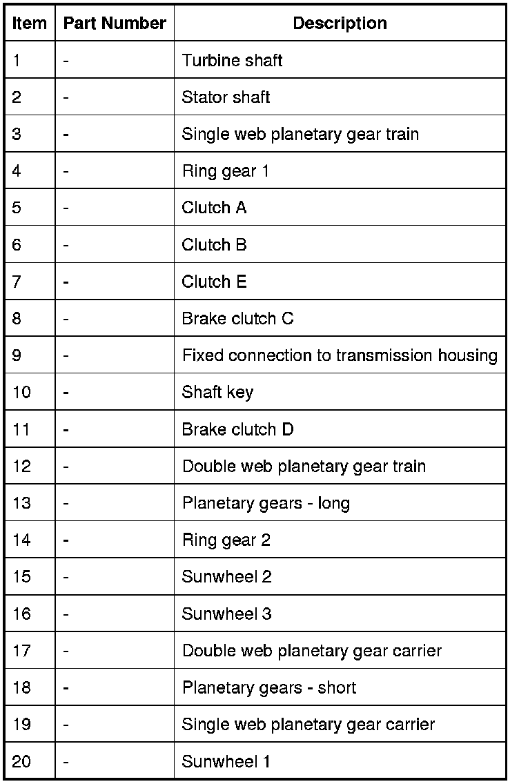 Engine torque is transferred, via operation of single or combinations of clutches to the 2 planetary gear trains. Both gear trains are controlled by reactionary inputs from brake clutches to produce the 6 forward gears and 1 reverse gear. The ratios are as follows: