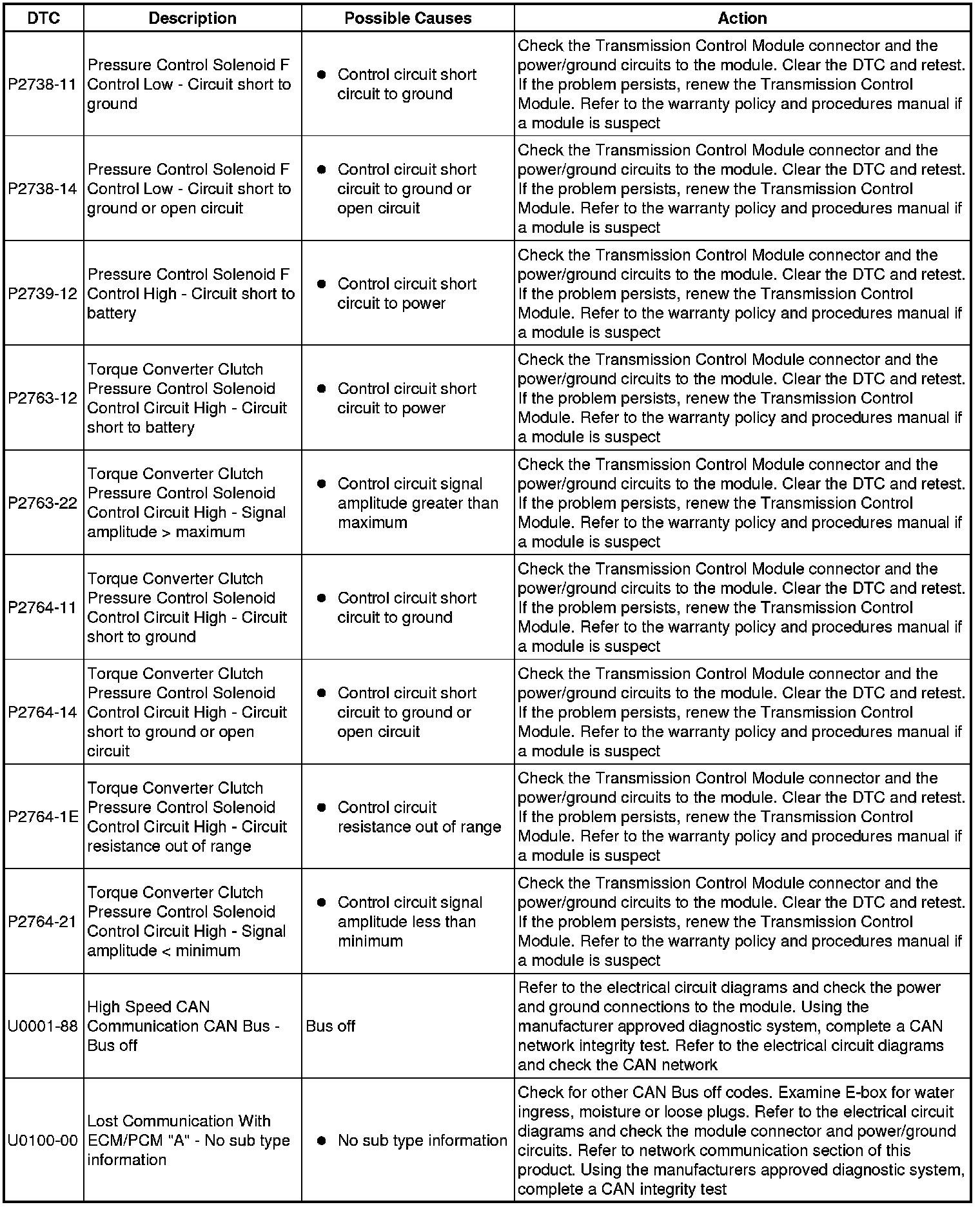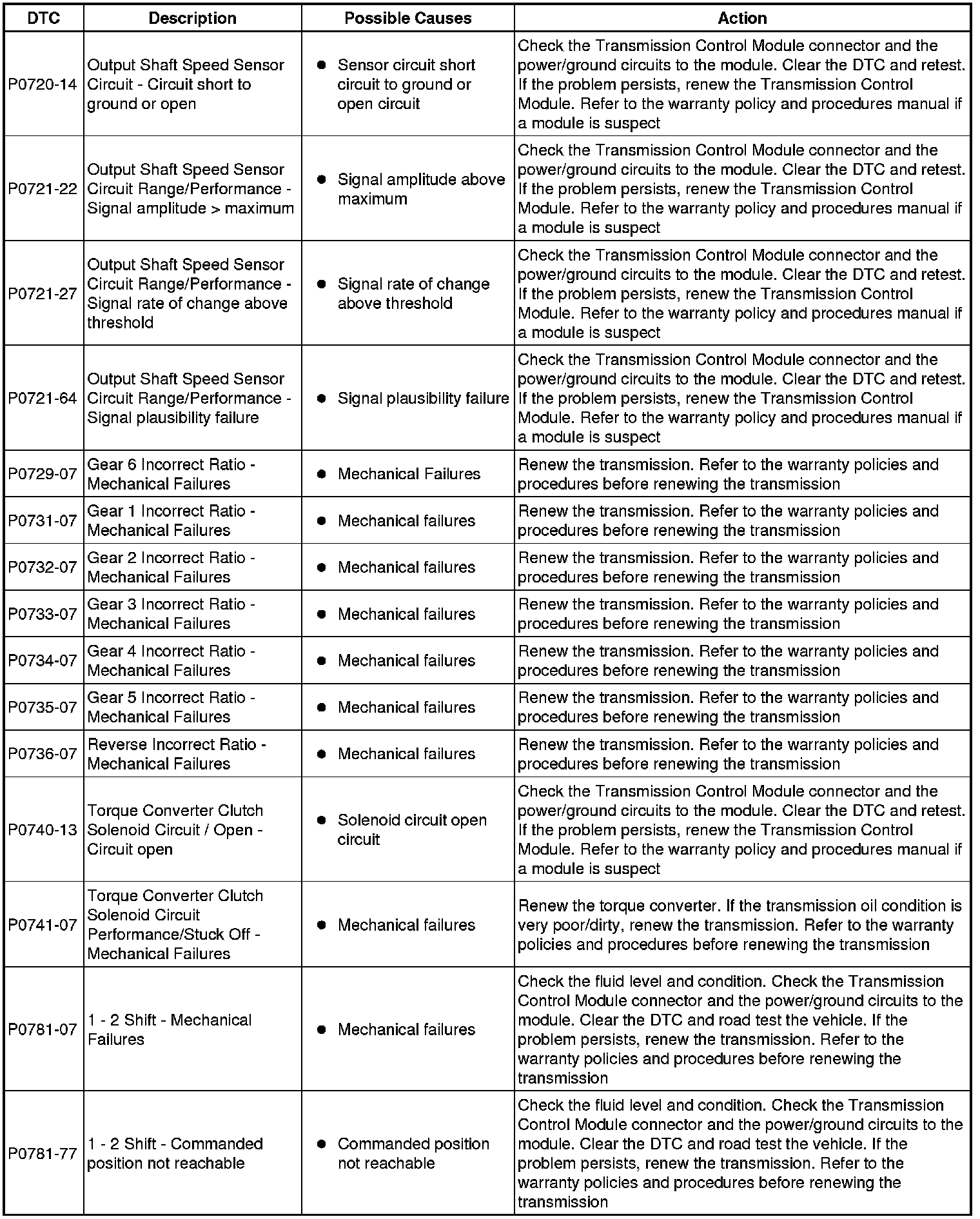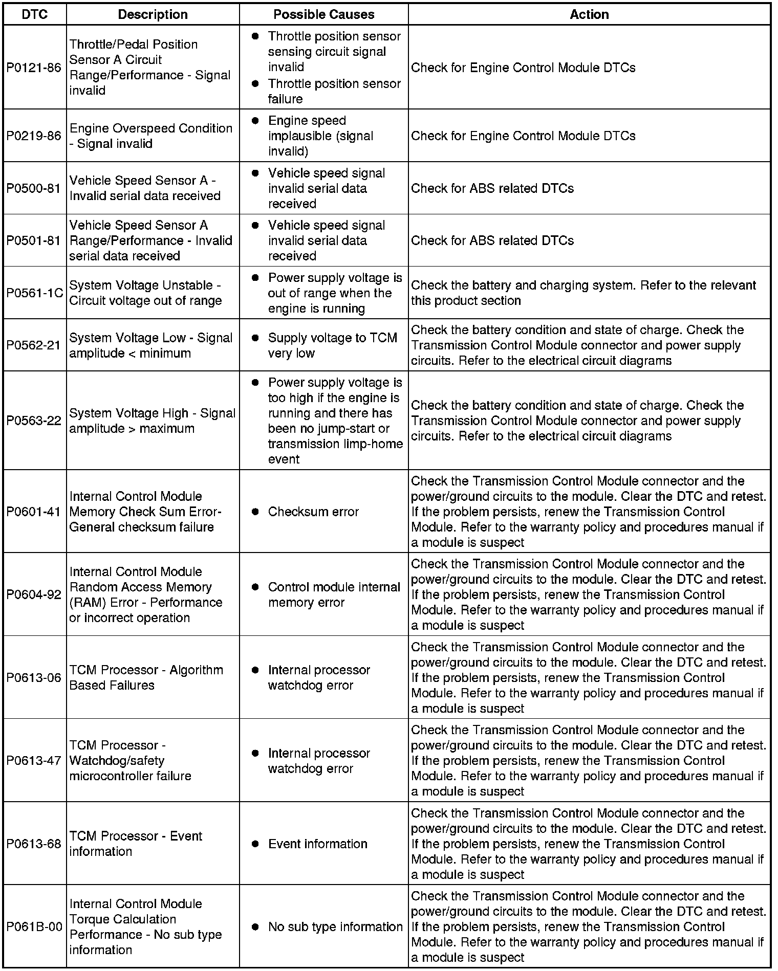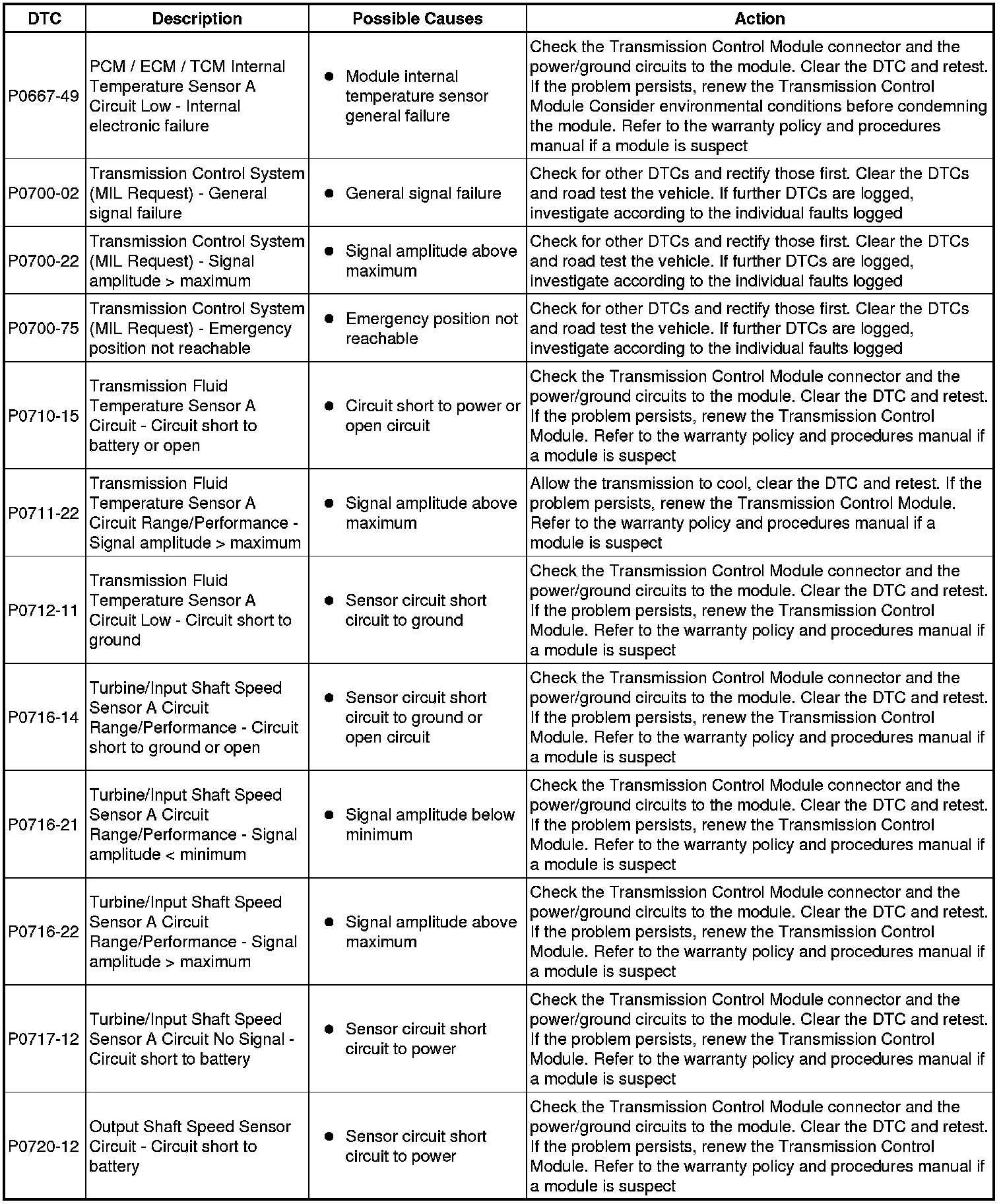 The table below lists all Diagnostic Trouble Codes (DTCs) that could be logged in the Transmission Control Module, for additional Diagnosis and Testing information refer to the relevant Diagnosis and Testing Section. For additional information, refer to Automatic Transmission Testing and Inspection