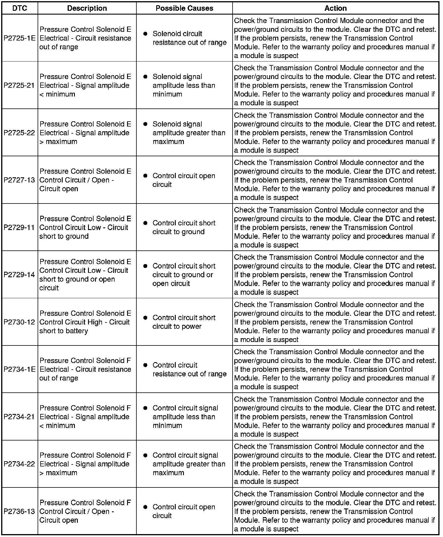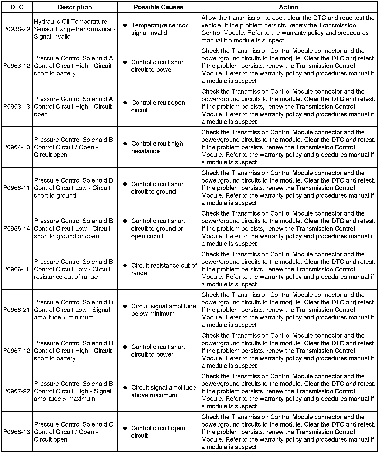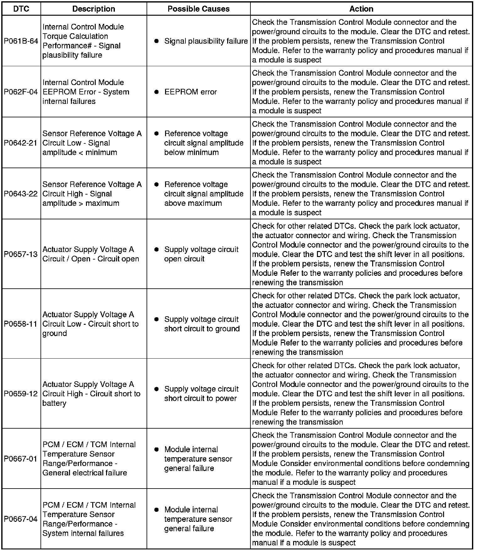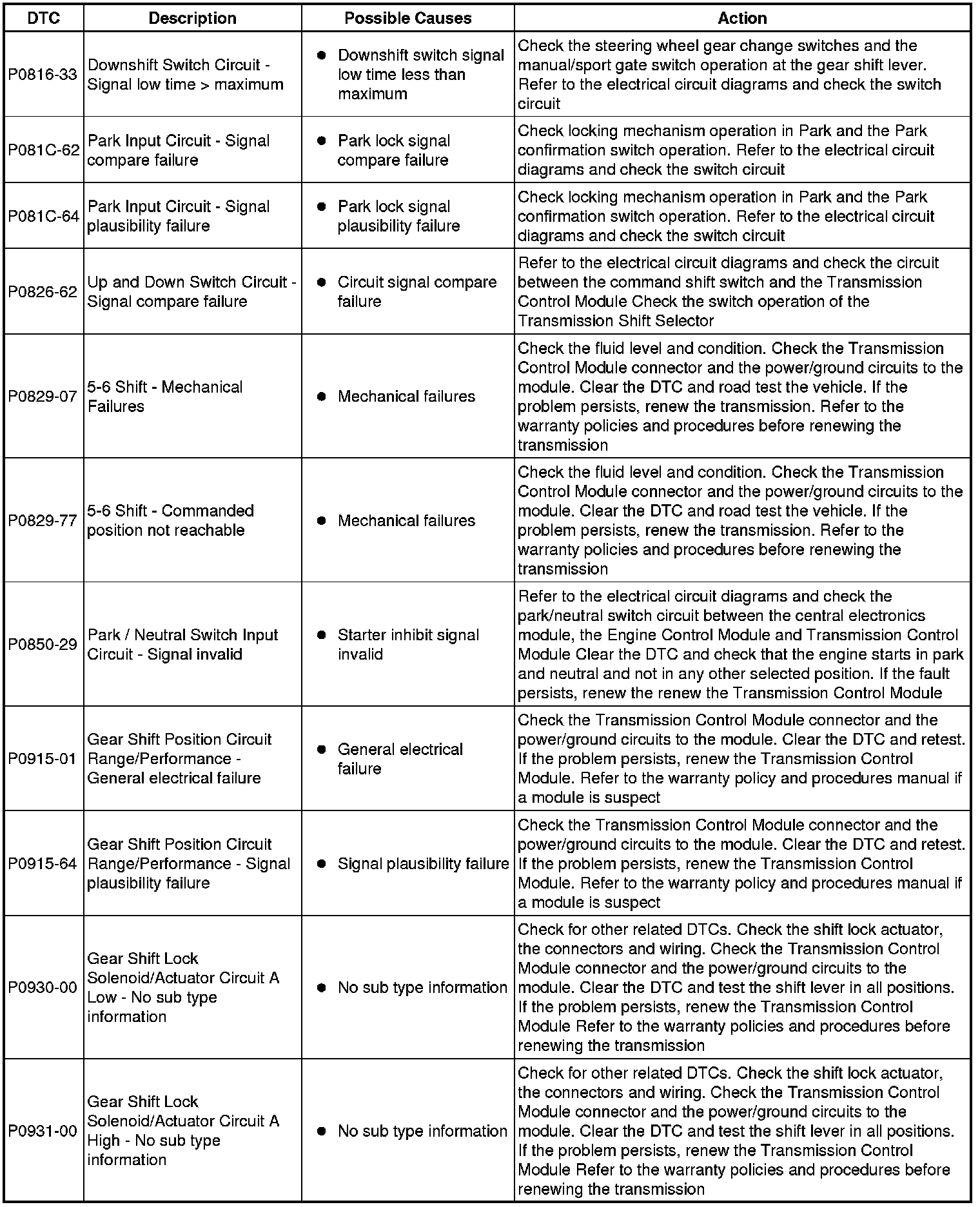 The table below lists all Diagnostic Trouble Codes (DTCs) that could be logged in the Transmission Control Module, for additional Diagnosis and Testing information refer to the relevant Diagnosis and Testing Section. For additional information, refer to Automatic Transmission Testing and Inspection