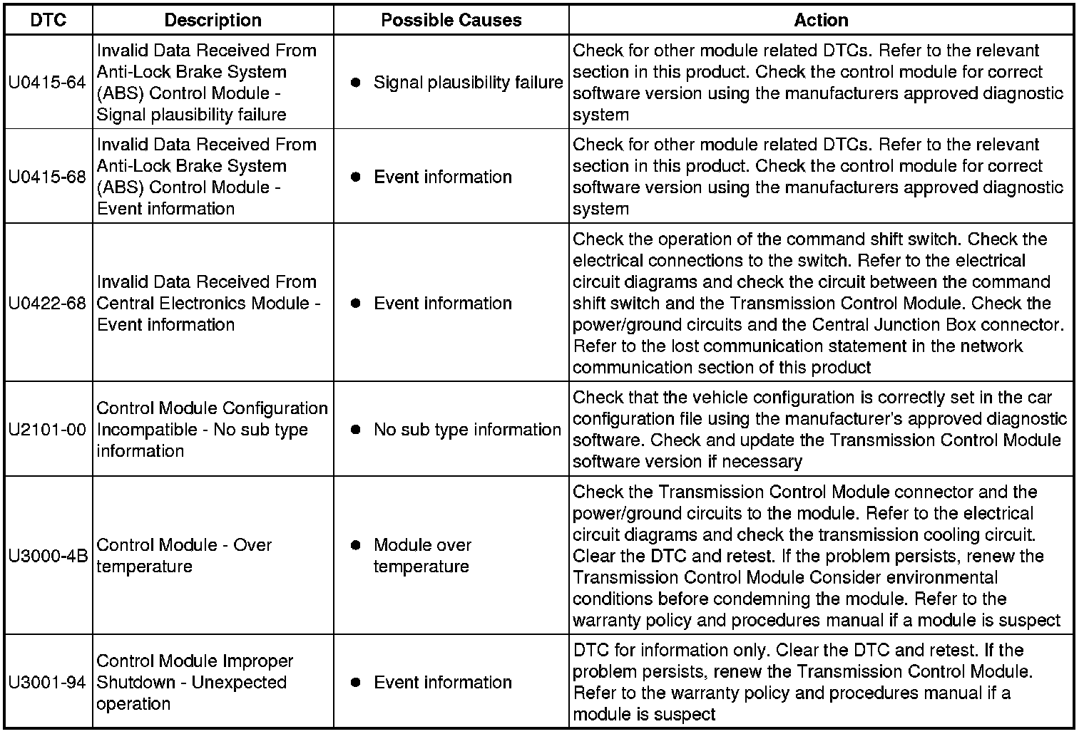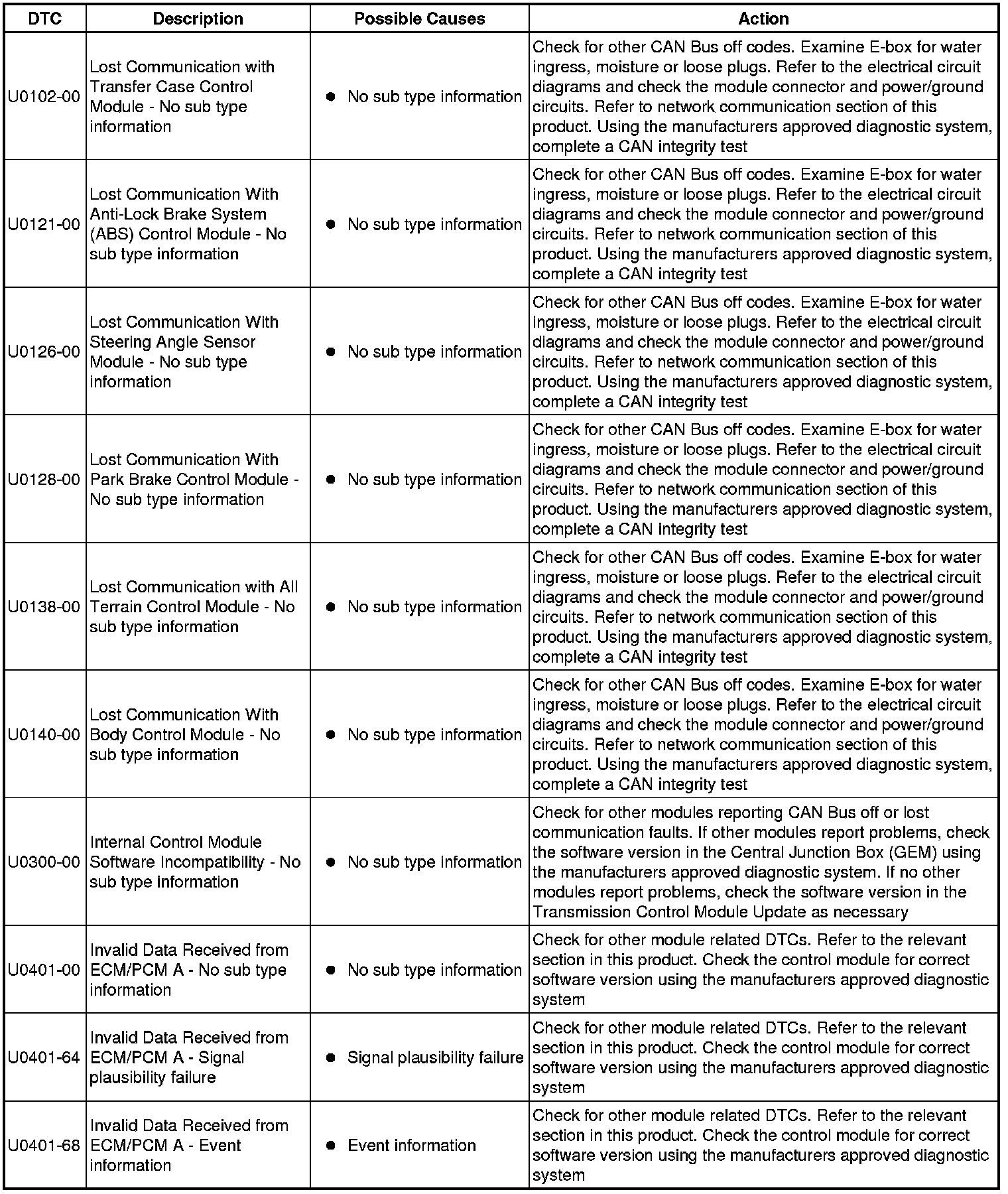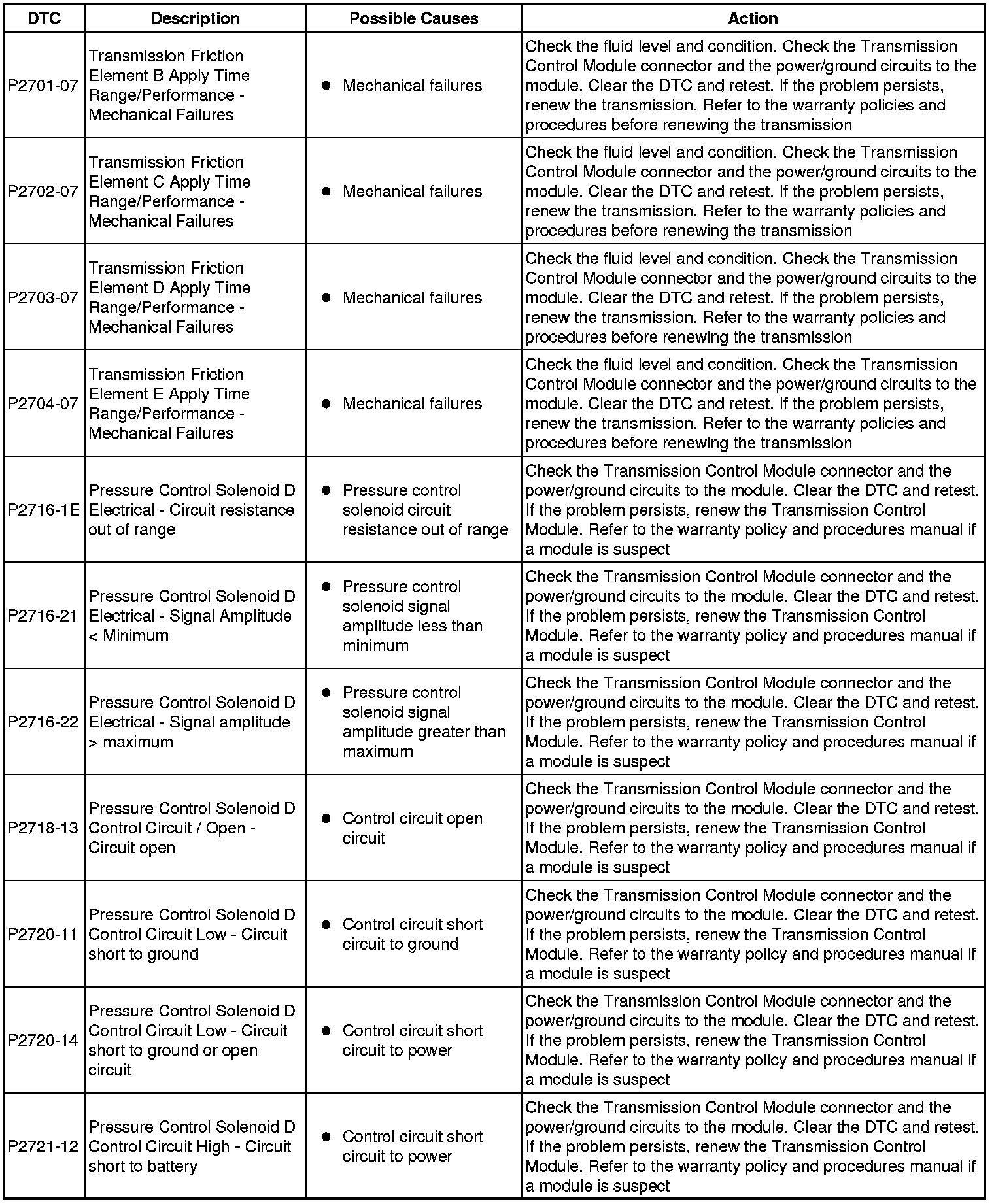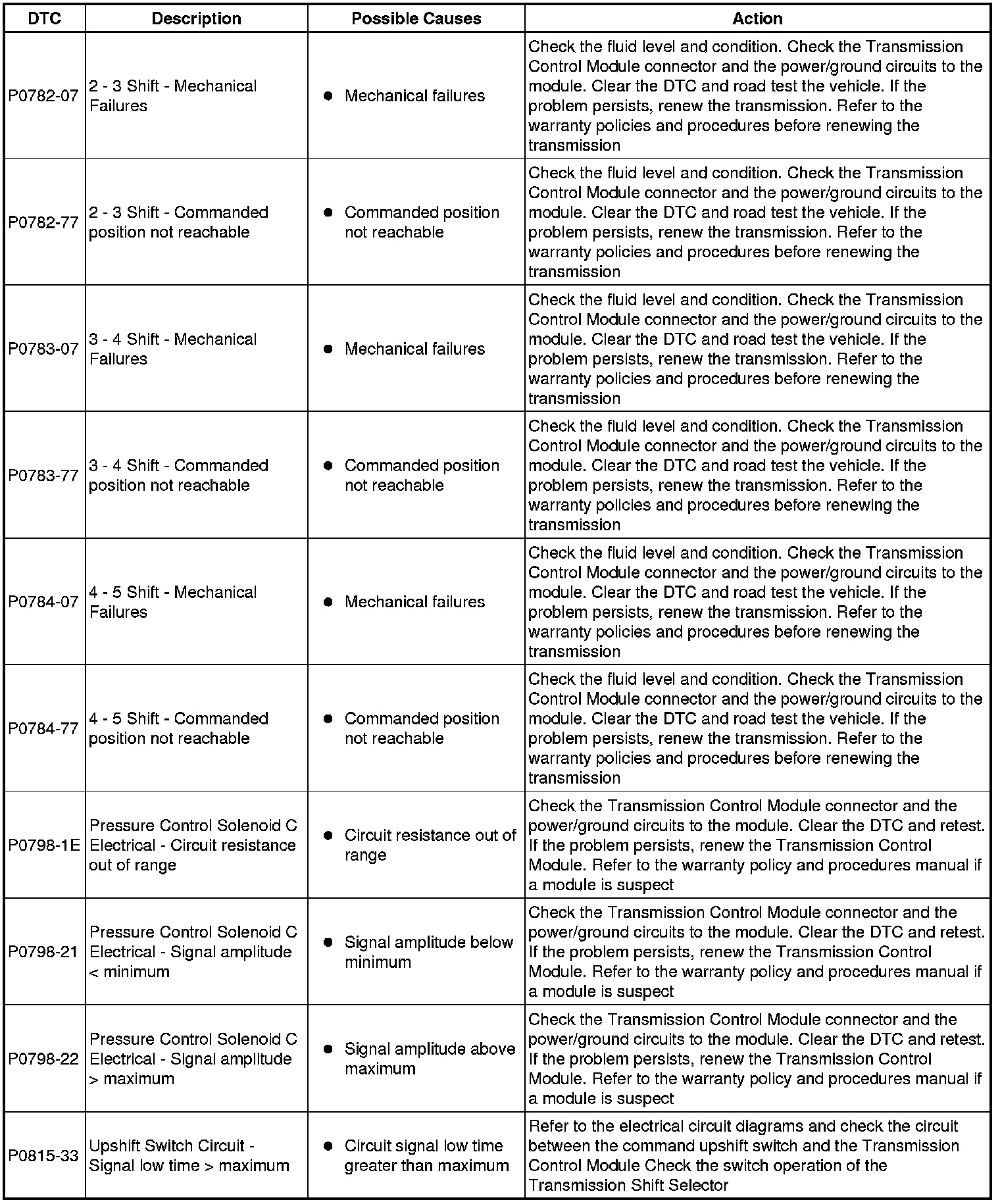 The table below lists all Diagnostic Trouble Codes (DTCs) that could be logged in the Transmission Control Module, for additional Diagnosis and Testing information refer to the relevant Diagnosis and Testing Section. For additional information, refer to Automatic Transmission Testing and Inspection