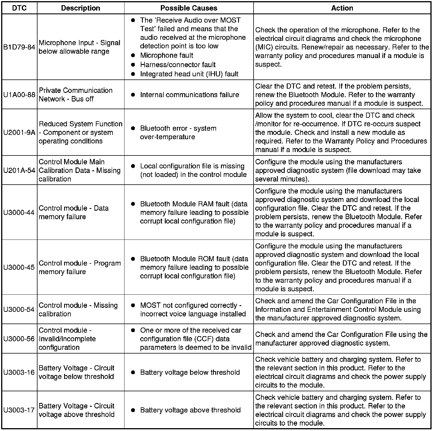 The table below lists all Diagnostic Trouble Codes (DTCs) that could be logged in the Bluetooth Module, for additional Diagnosis and Testing information refer to the relevant Diagnosis and Testing Section. For additional information, refer to Cellular Phone Initial Inspection and Diagnostic Overview