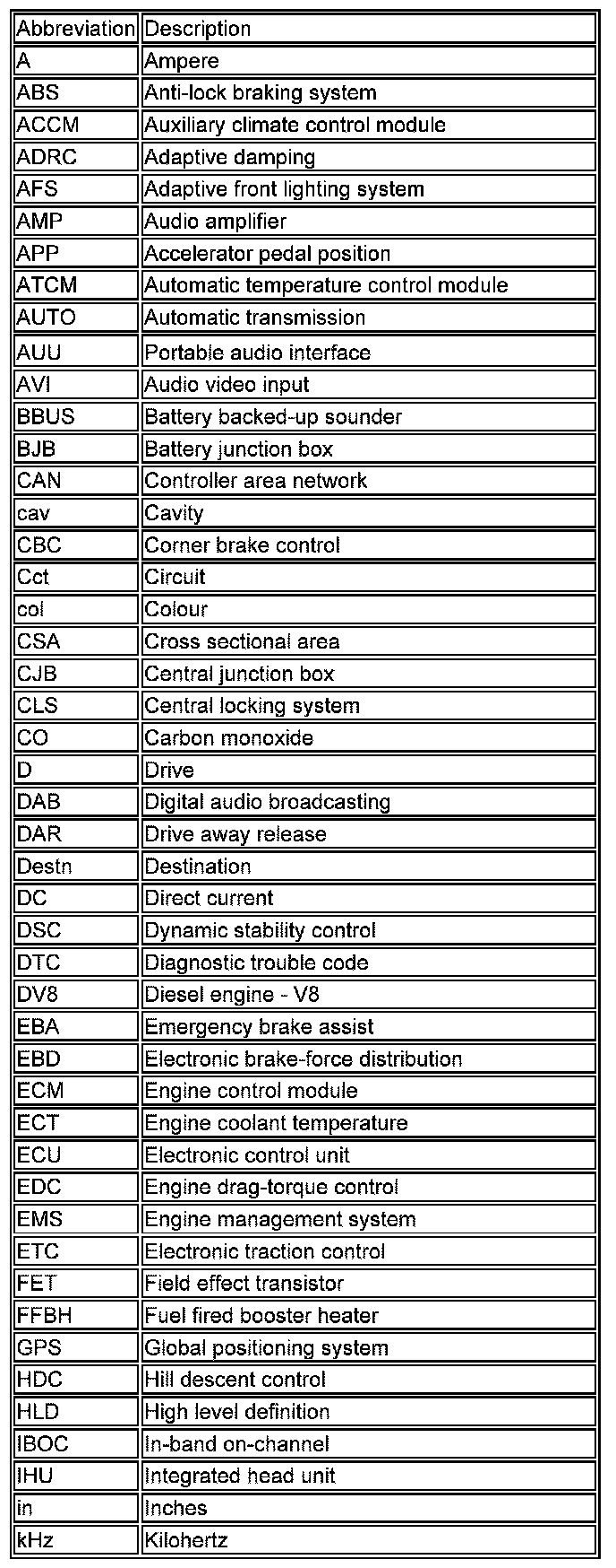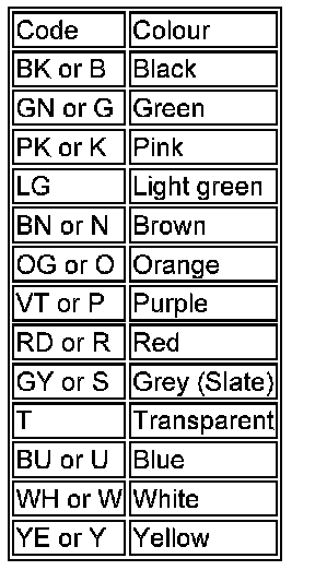 The following list contains wire colour codes used on the vehicle harnesses.