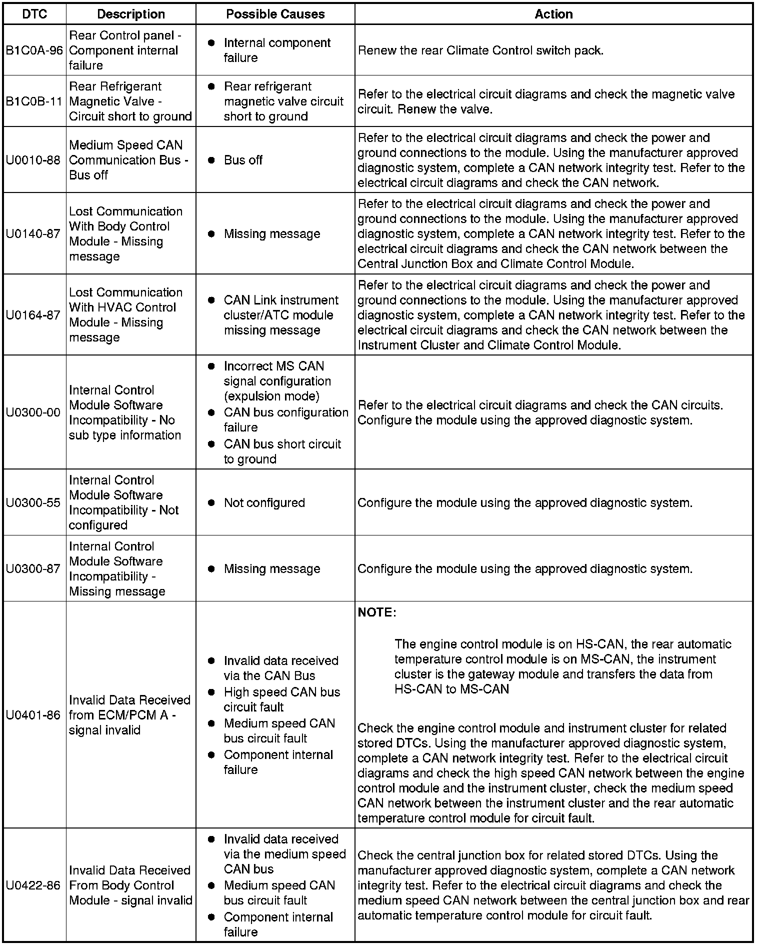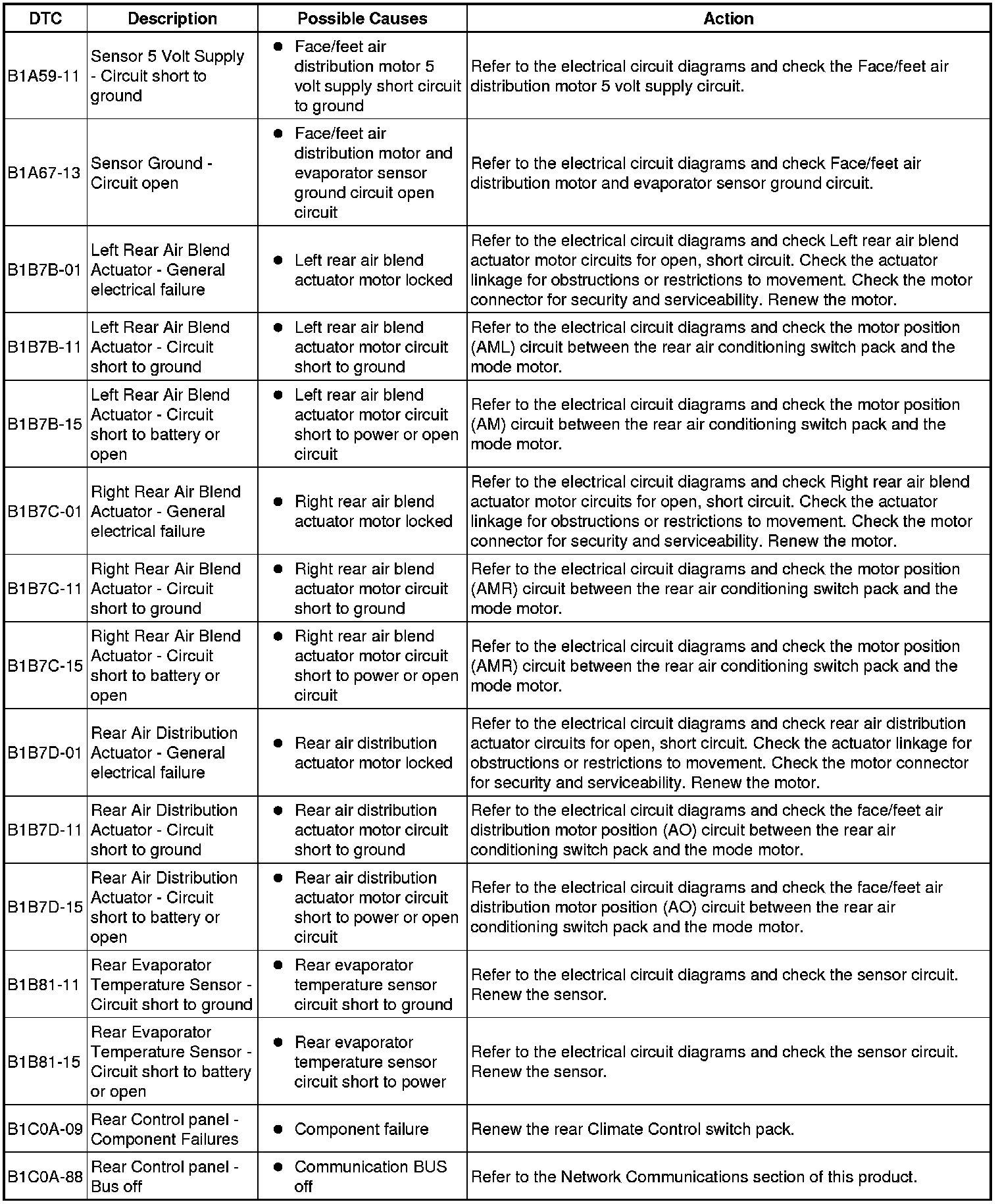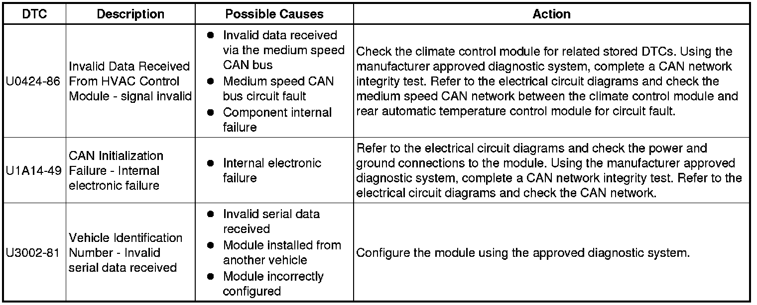 The table below lists all Diagnostic Trouble Codes (DTCs) that could be logged in the Climate Control Module, for additional Diagnosis and Testing information refer to the relevant Diagnosis and Testing Section. For additional information, refer to Climate Control System