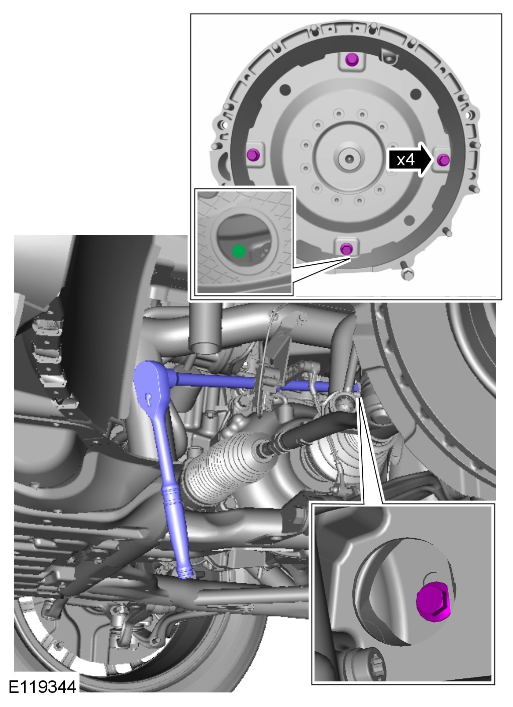 Make sure that the alignment mark is visible through the inspection hole on removal of the last torque converter bolt.