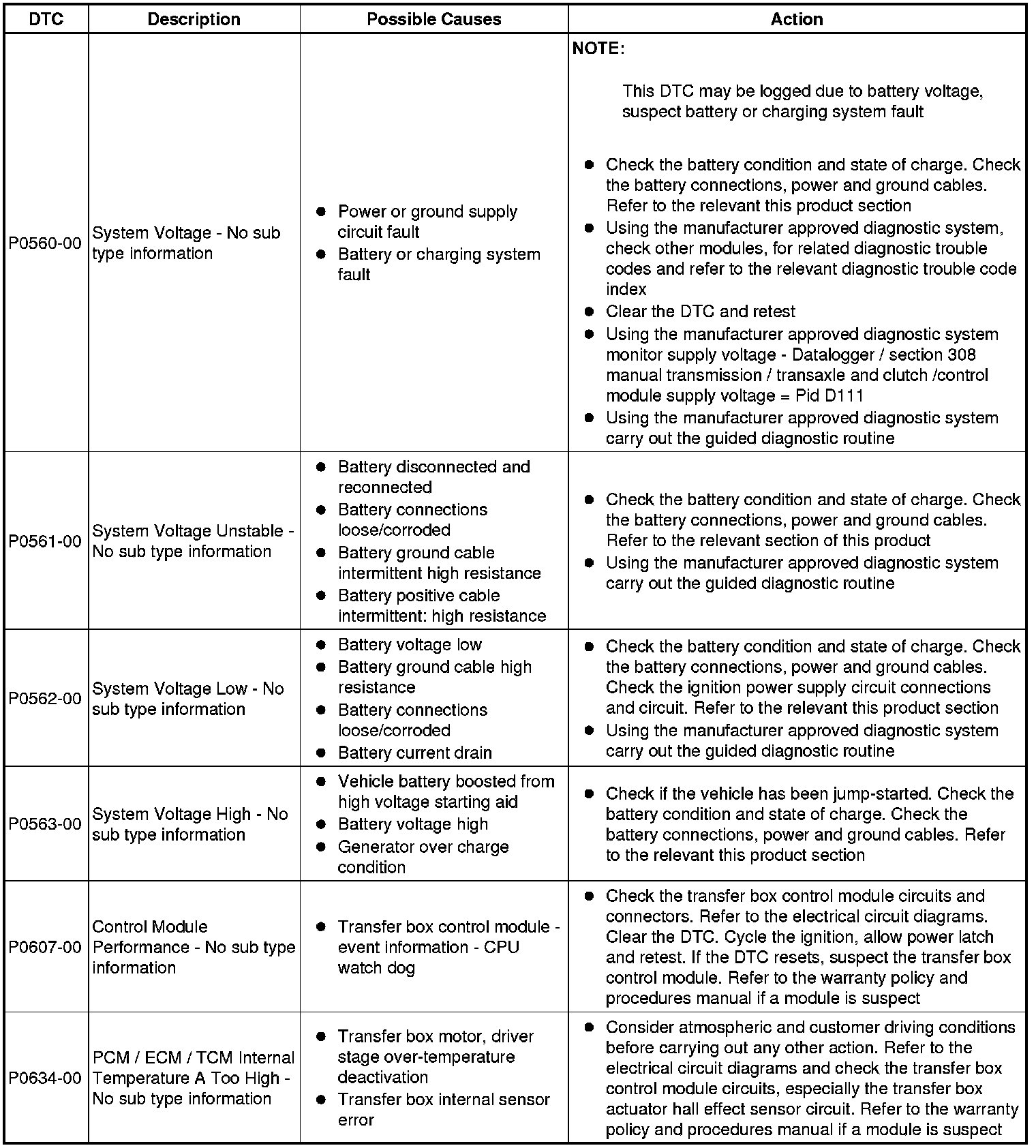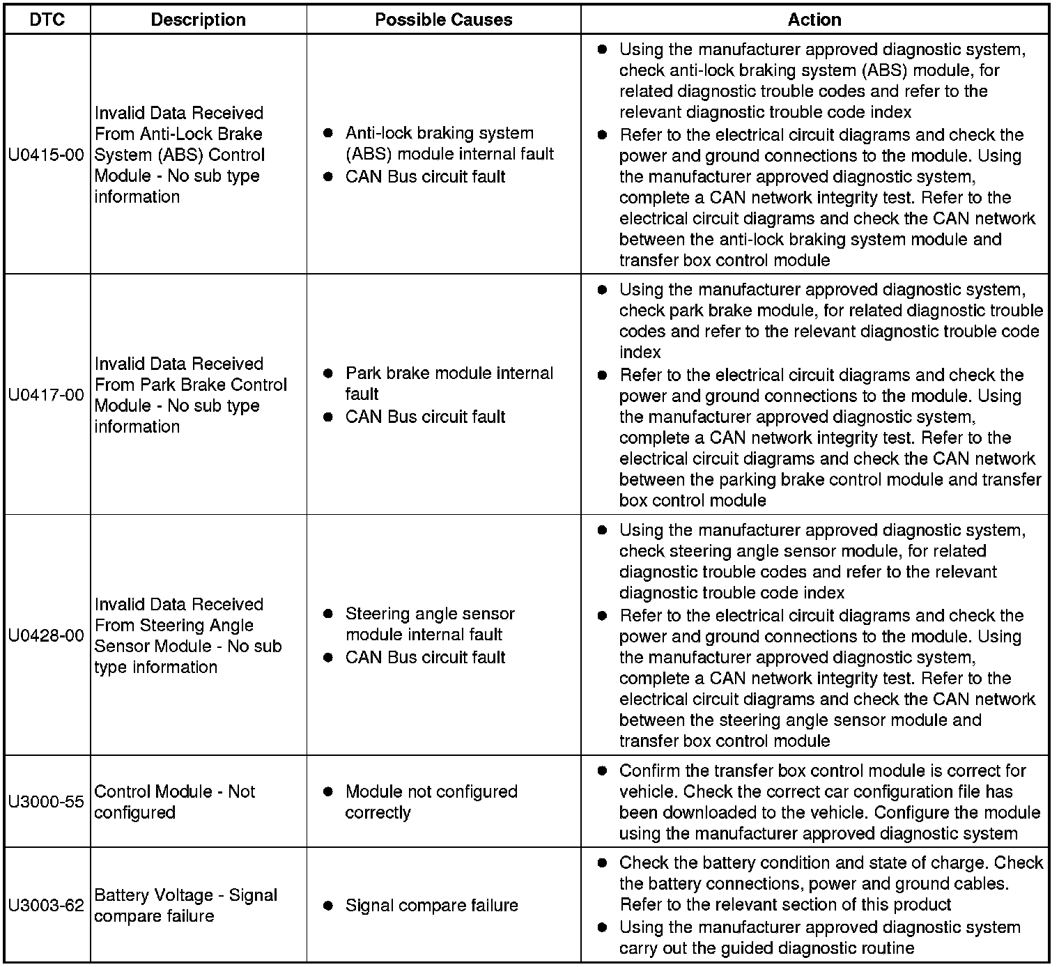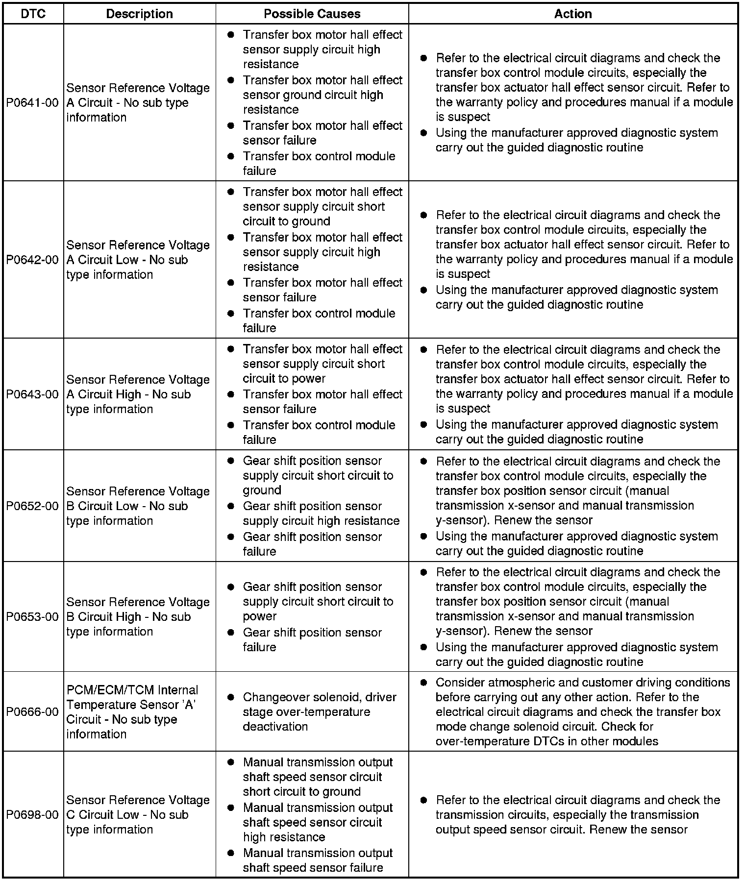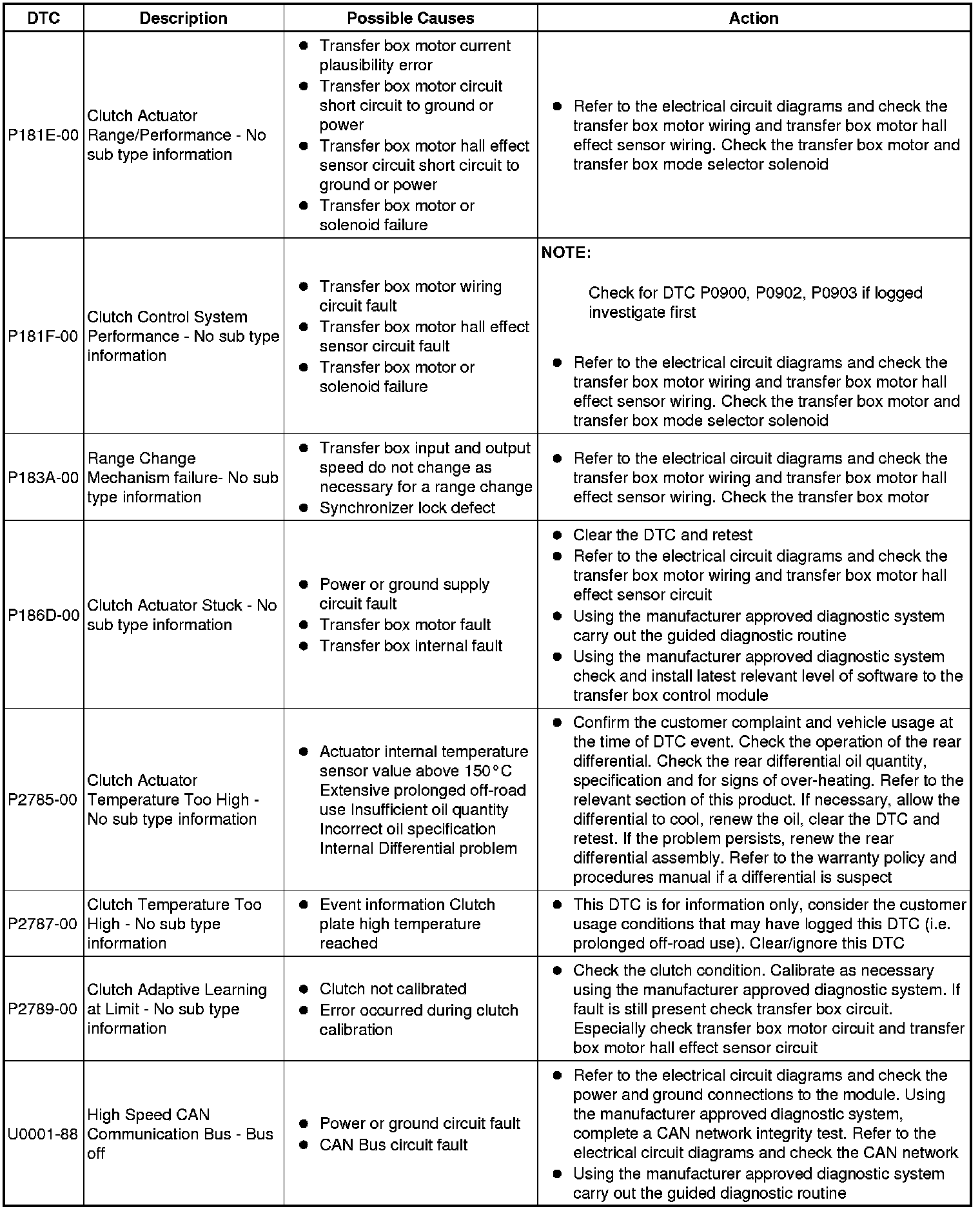 The table below lists all Diagnostic Trouble Codes (DTCs) that could be logged in the Transfer Case Control Module, for additional Diagnosis and Testing information refer to the relevant Diagnosis and Testing Section. For additional information, refer to Transfer Case