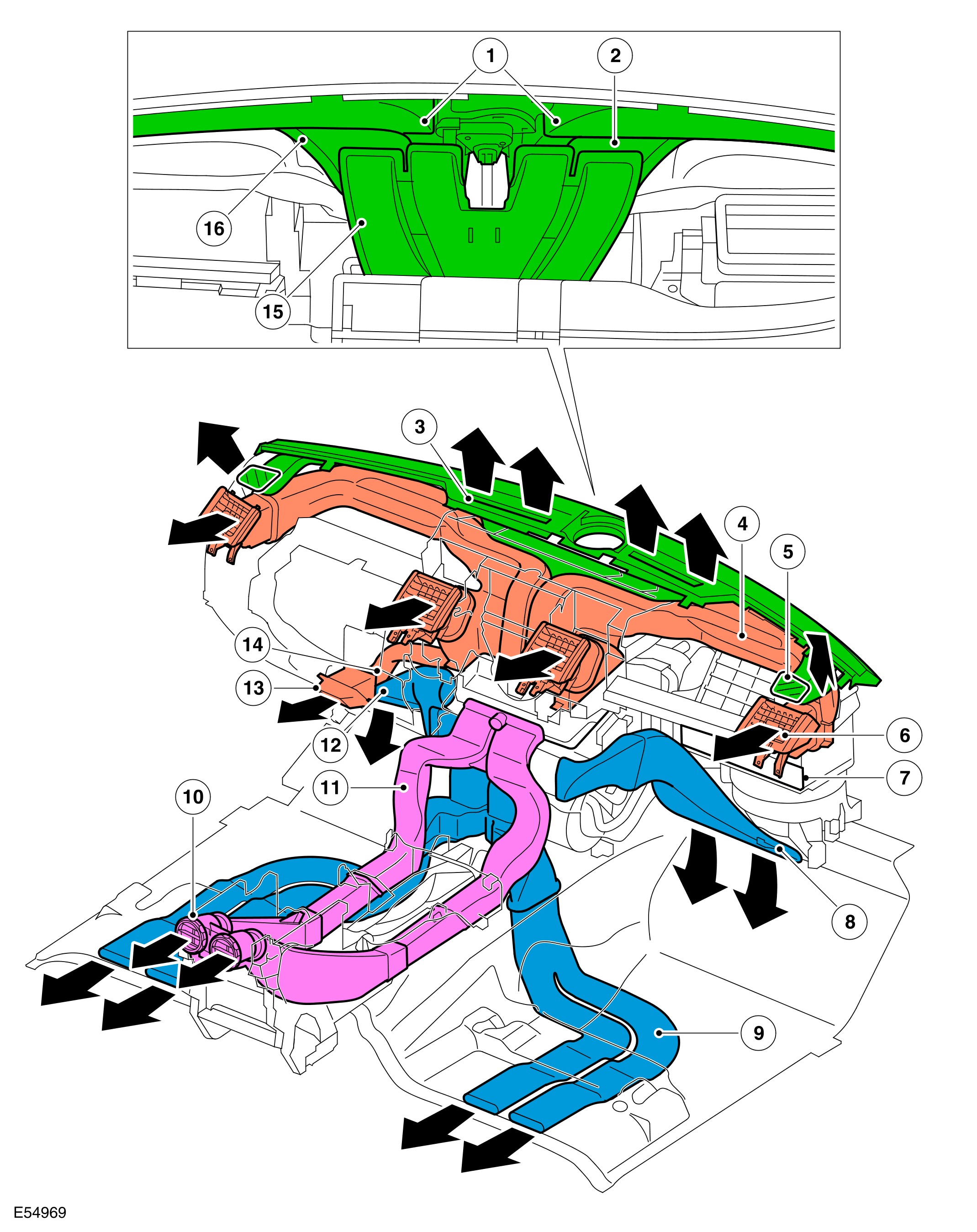The air ducts distribute the air from the heater to the various registers and air vents around the vehicle interior. The air ducts for the instrument panel registers, the driver lap register and the second row registers are connected to the heater outlet manifold on top of the heater. The air ducts for the front and second row footwells are connected direct to outlet ports on the heater. The air ducts for the windshield vents and the side window vents form part of the structure of the instrument panel.