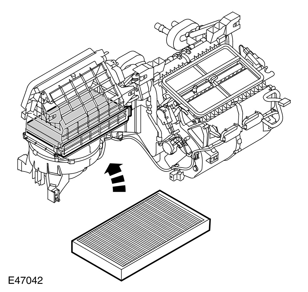 The cabin air filter is a combined pollen and odor filter installed in the air inlet duct. The filter removes particulates and unpleasant odors from the fresh and recirculated air entering the blower.