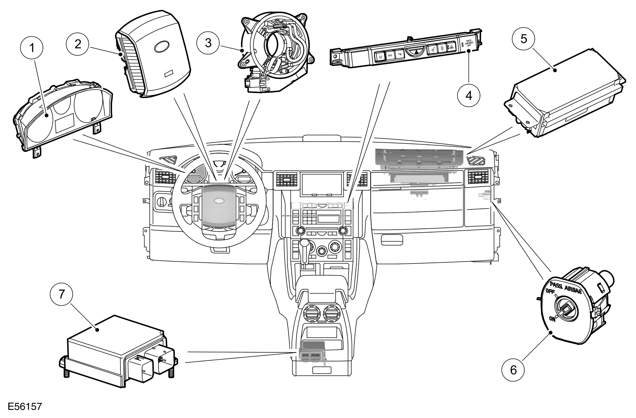 The passenger air bag deactivation indicator is installed on the center switch pack of the instrument panel. When appropriate, the indicator illuminates to advise front seat occupants that the passenger air bag is disabled. Operation of the indicator is controlled by the RCM (restraints control module) based on seat occupancy status derived from the occupant classification system (NAS vehicles) or the passenger air bag deactivation switch (all except NAS and Australian specification vehicles).