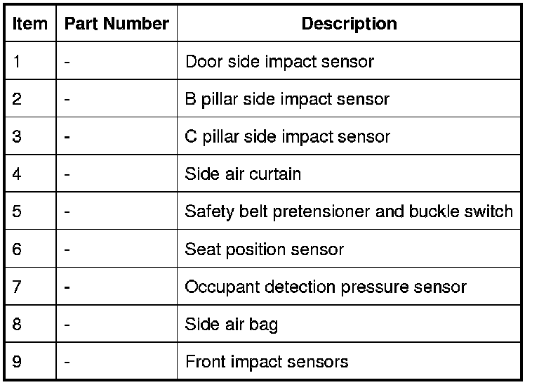 Impact sensors are installed in the front and both sides of the vehicle. The use of multiple impact sensors provides shorter air bag trigger times, through faster detection of lateral and longitudinal acceleration, and improves detection accuracy.
