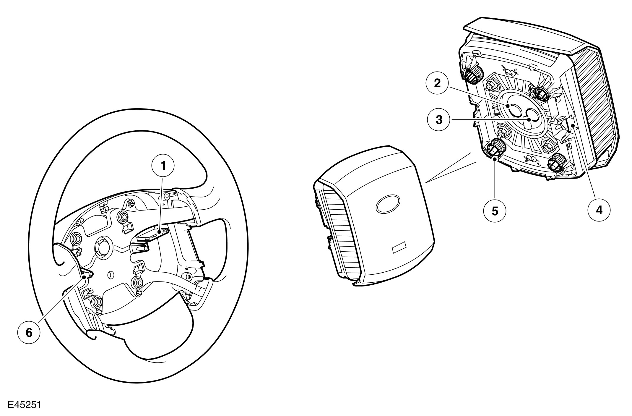 The driver air bag forms the center pad of the steering wheel. Four pins and two latches locate and secure the driver air bag to the steering wheel. The latches consist of wire springs on each side of the driver air bag which engage with hooks in the steering wheel. The driver air bag is released from the steering wheel by pulling on the wire springs with a special tool inserted through a slot on each side of the steering wheel hub. Springs on the locating pins then push the driver air bag away from the steering wheel.
