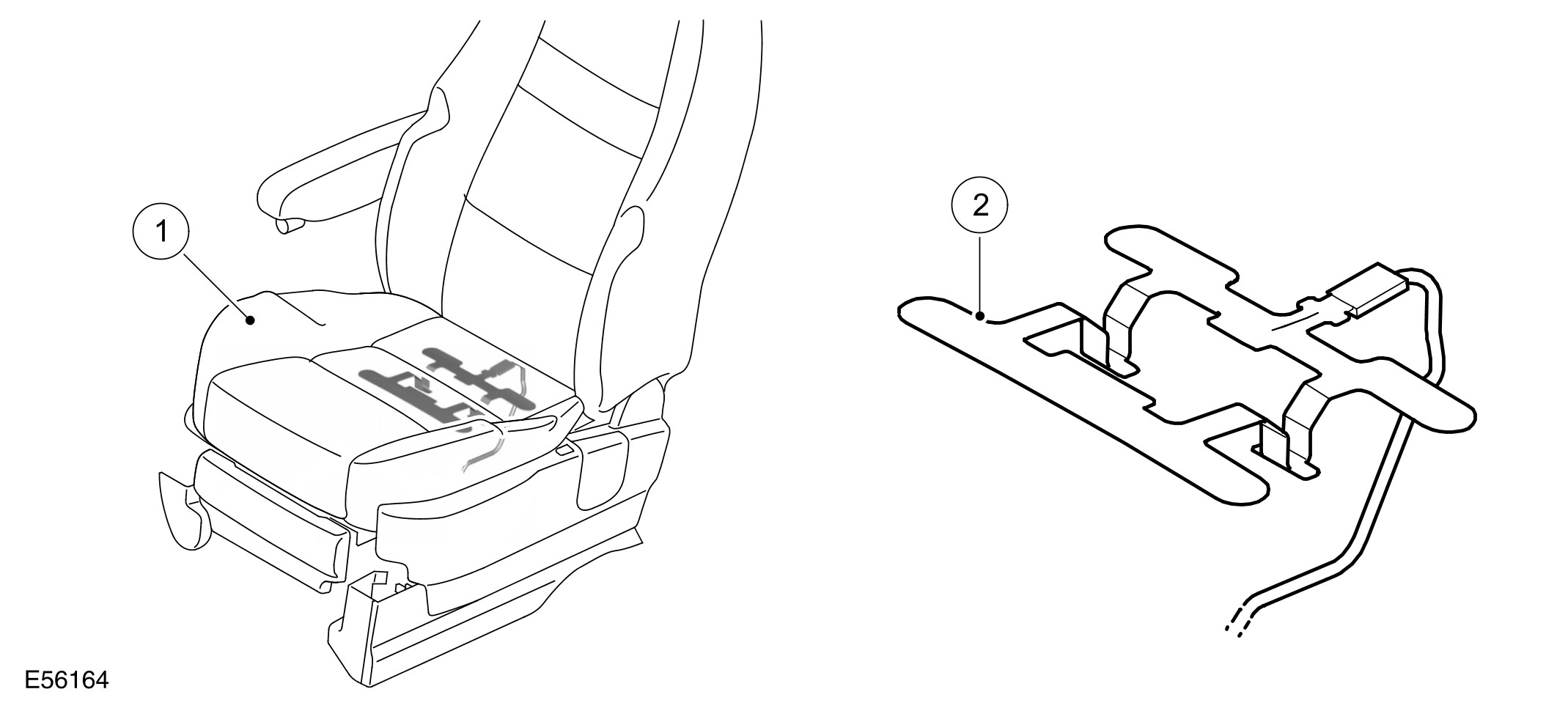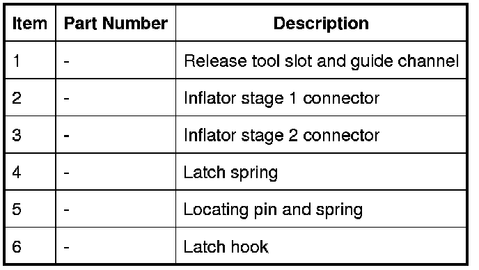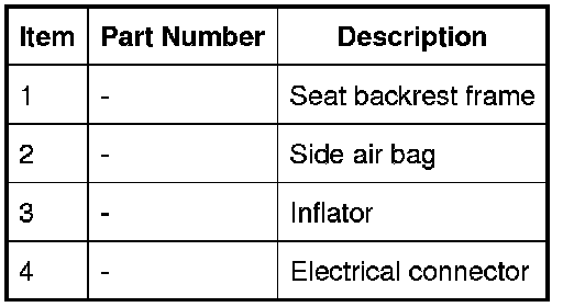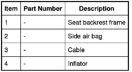 The side air bags are handed, and each consist of a molded plastic case which contains the folded air bag and the inflator. In all markets except NAS the side air bags incorporate a cable that connects the igniter of the inflator to a connector in the main seat harness connector block located under the front edge of the seat cushion. In NAS markets the seat harness is connected to an electrical connector in the base of the inflator.