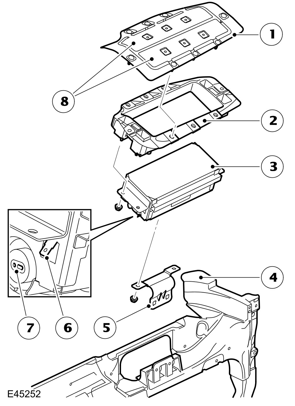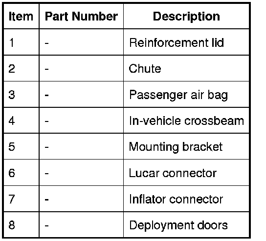 The passenger air bag is located in the instrument panel, behind the upper glove compartment. The bottom of the passenger air bag is attached to a mounting bracket on the in-vehicle crossbeam. The top of the passenger air bag is attached to a chute, which, in turn, is attached to a reinforcement lid in the top of the instrument panel. When the air bag deploys, the chute guides the air bag to the underside of the reinforcement lid. The reinforcement lid incorporates two deployment doors that are forced open, splitting the instrument panel covering, when the air bag deploys.