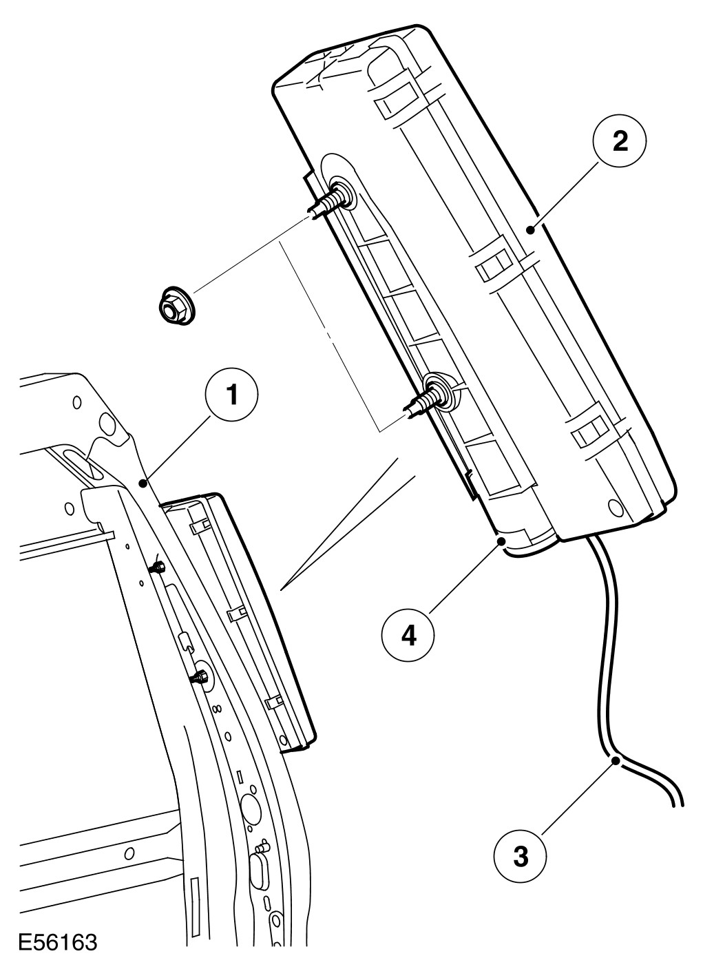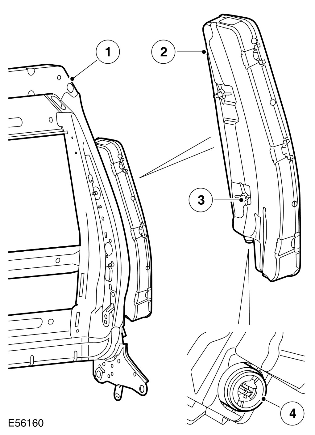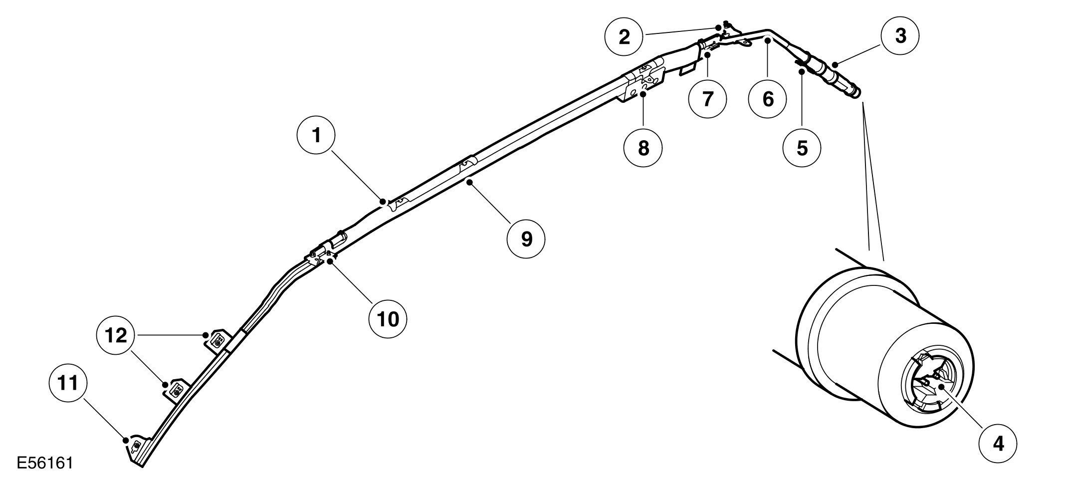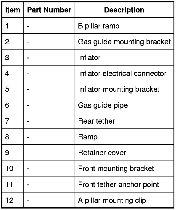 Each side air curtain has an inflator, which is attached to the E pillar by a mounting bracket. The inflator is connected to the air curtain by a gas guide pipe.