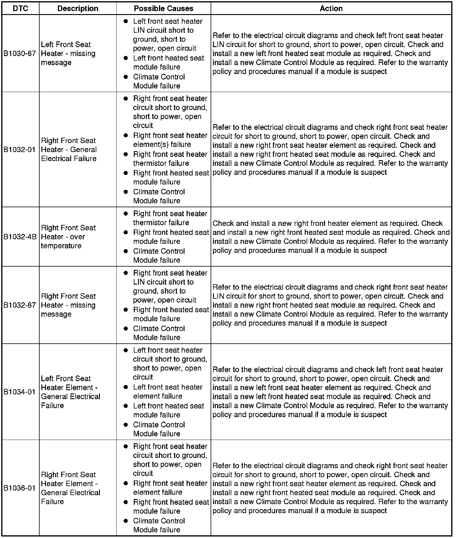 The table below lists all Diagnostic Trouble Codes (DTCs) that could be logged in the Climate Control Module, for additional Diagnosis and Testing information refer to the relevant Diagnosis and Testing Section. For additional information, refer to Climate Control System Climate Control System