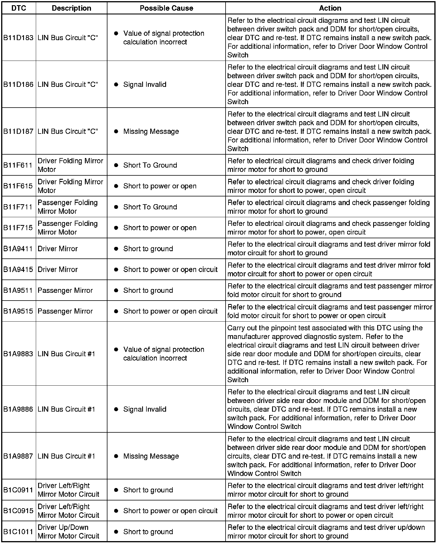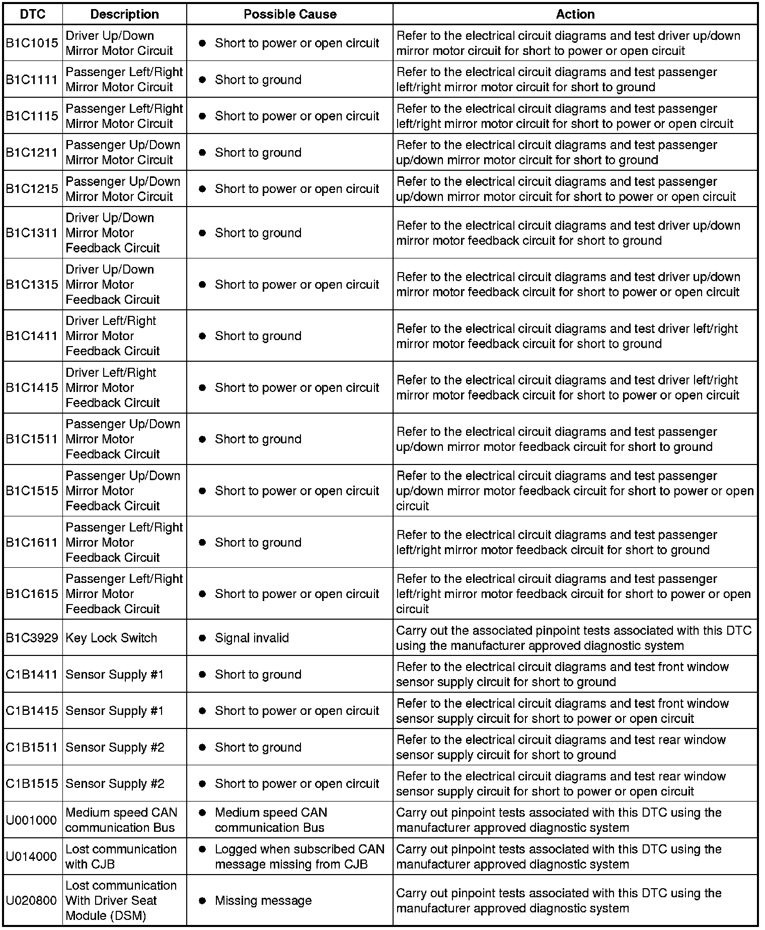 The DTC Index in this section shows information for DTCs that could be logged in the Driver Door Module (DDM) or Passenger Door Module (PDM). For diagnosis and testing information for: Driver Seat module. For additional information, refer to Seats Testing and Inspection Information and Entertainment module. For additional information, refer to Information and Entertainment System