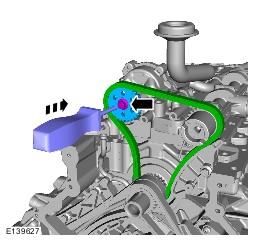 4 Install the lower timing chain making sure the colored chain links align correctly with the fuel rail high-pressure fuel pumps camshaft and crankshaft sprocket markings.