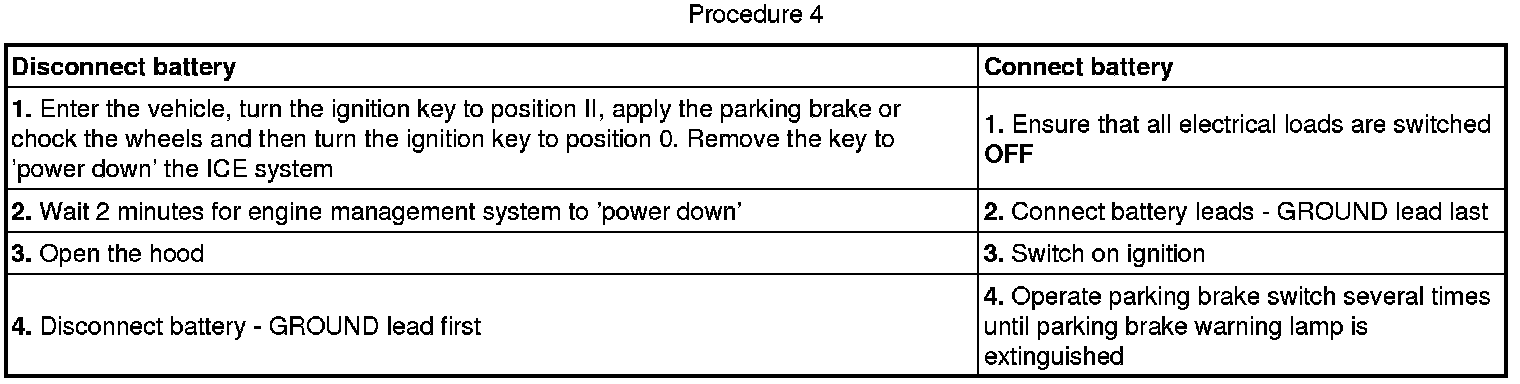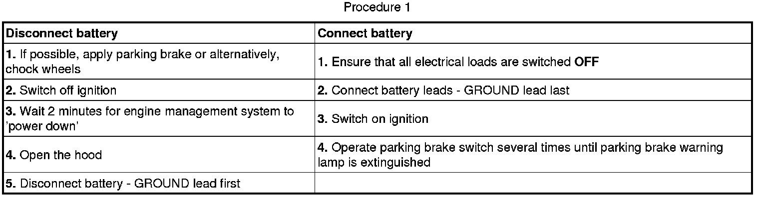 CAUTION: The vehicle status and battery condition must be established before attempting battery disconnect/connect. Reference must be then made to the following table to establish the relevant procedure to be followed.