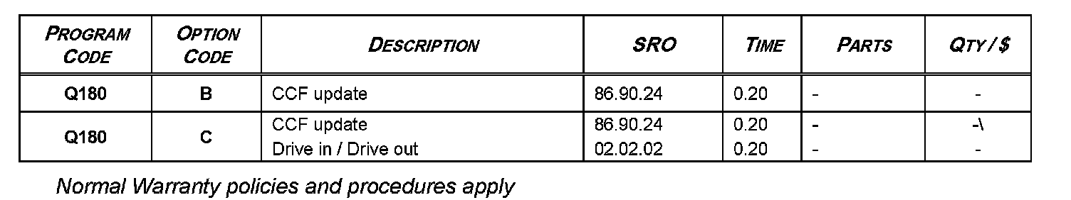 Warranty claims should be submitted quoting the Program Code Q180 together with the relevant Option Code; this will result in payment of the stated time. As Option Codes are used, there is no requirement to enter SRO information; these are displayed for information only. The option that allows for drive in / drive out may only be claimed if the vehicle is brought back into the workshop for this action alone to be undertaken.