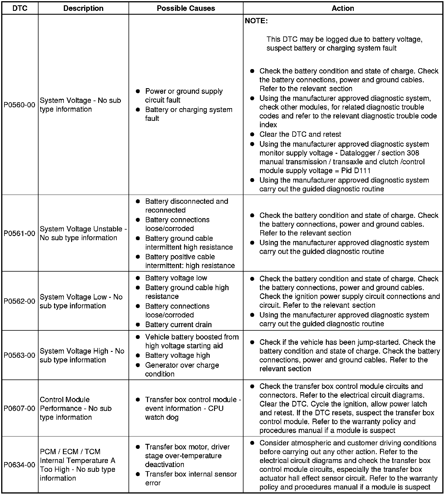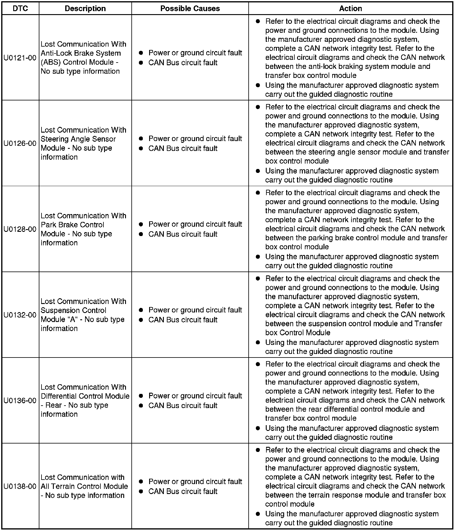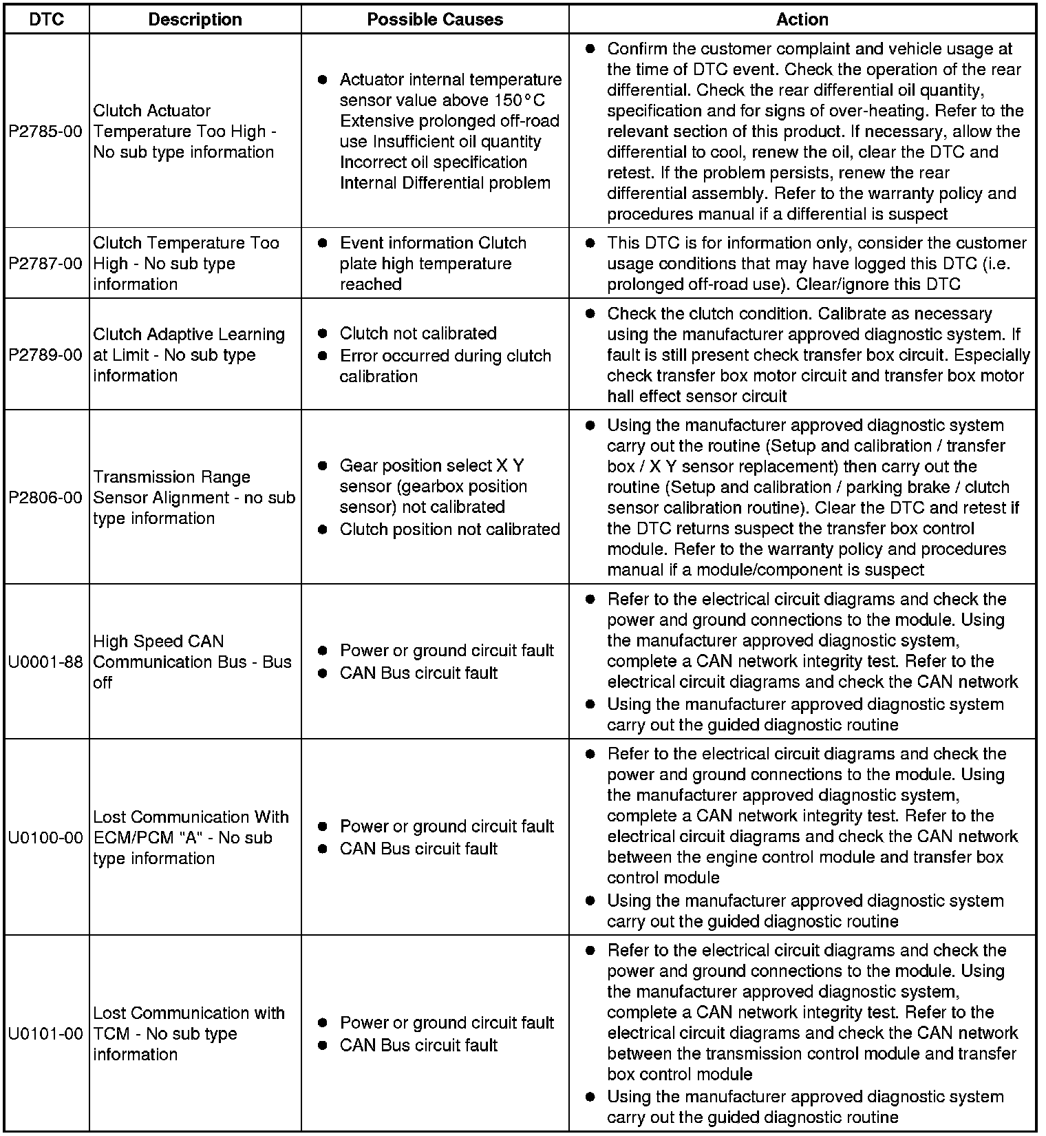 The table below lists all Diagnostic Trouble Codes (DTCs) that could be logged in the transfer box control module, for additional Diagnosis and Testing information refer to the relevant Diagnosis and Testing Section. For additional information, refer to Transfer Case Testing and Inspection