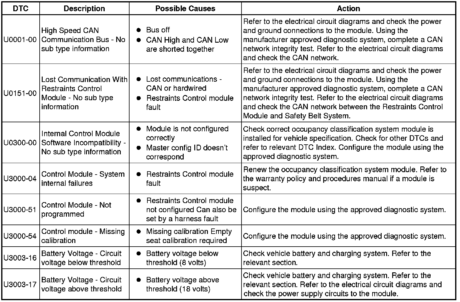 The table below lists all Diagnostic Trouble Codes (DTCs) that could be logged in the Occupant Classification System Module, for additional Diagnosis and Testing information refer to the relevant Diagnosis and Testing Section. For additional information, refer to Air Bag Supplemental Restraint System (SRS) Testing and Inspection