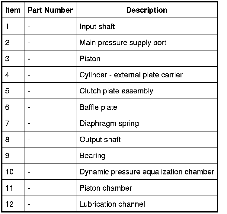When clutch application is required, main pressure from the fluid pump is applied to the piston chamber from the supply port. This main pressure overcomes the low pressure fluid present in the dynamic pressure equalization chamber. The piston moves, against the pressure applied by the diaphragm spring, and compresses the clutch plate assembly. When the main pressure falls, the diaphragm spring pushes the piston away from the clutch plate assembly, disengaging the clutch.