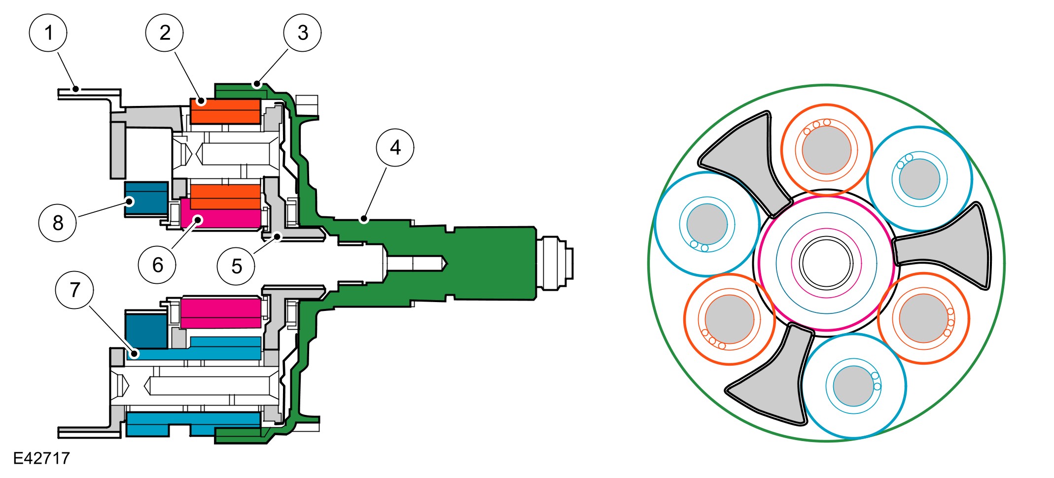 Ring gear 1 drives the planetary gears which rotate around sunwheel 1. This drives the planetary gear carrier 1 and also the outer plate carrier of clutch 'A' and the inner plate carrier of clutch 'B'.
