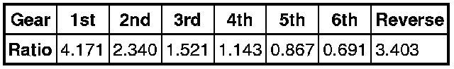 Engine torque is transferred, via operation of single or combinations of clutches to the 2 planetary gear trains. Both gear trains are controlled by reactionary inputs from brake clutches to produce the 6 forward gears and 1 reverse gear. The ratios are as follows:
