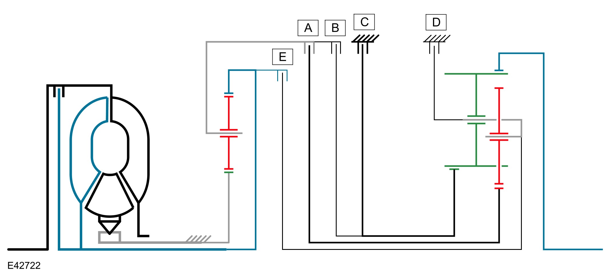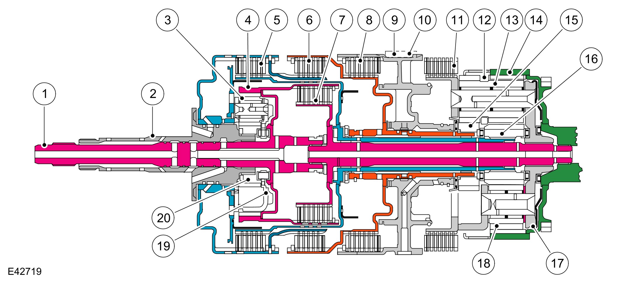 The shift elements are three rotating multiplate clutches (A, B and E) and two fixed multiplate brakes (C) and D). All shifts from 1st to 6th gears are power-on overlapping shifts. Overlapping shifts can be described as one of the clutches continuing to transmit drive at a lower main pressure until the next required clutch is able to accept the input torque.