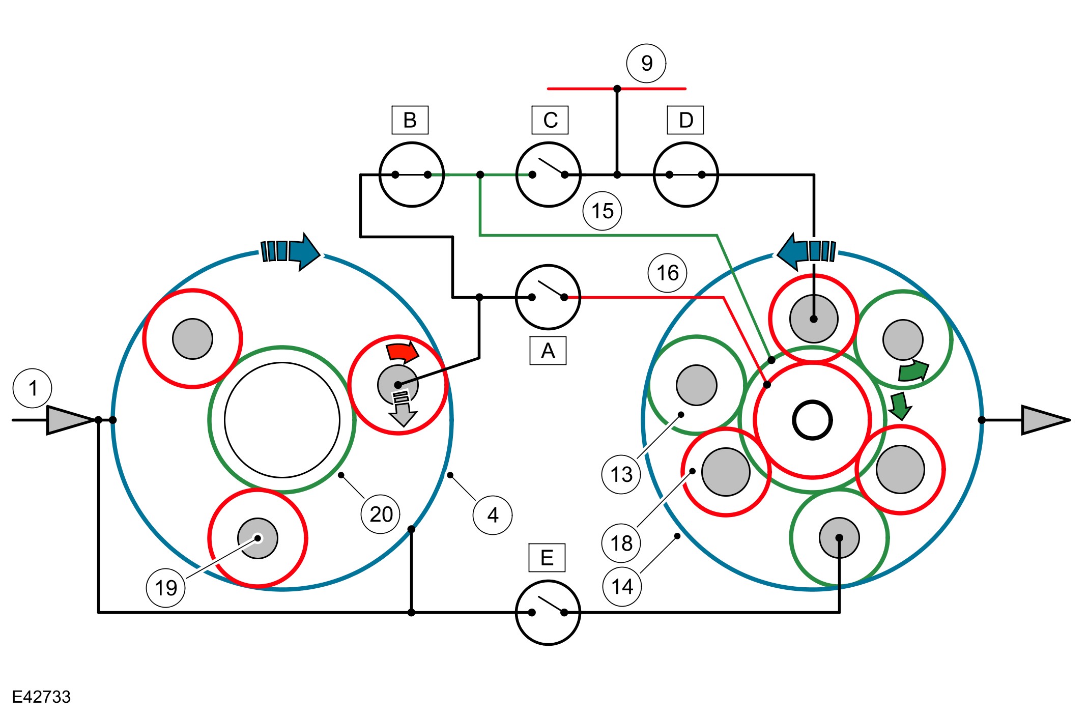 The selector lever and the selector spool valve are in the 'R' position. Engine torque is transmitted from the torque converter turbine shaft to ring gear 1 of the single web planetary gear train and the outer plate carrier of clutch 'E'.