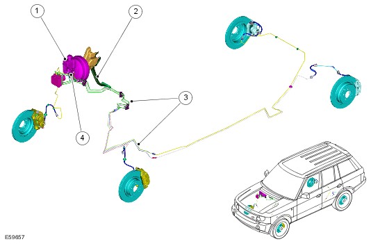The brake pipes and hoses connect the master cylinder to the wheel brakes via the hydraulic control unit. The pipes are arranged to provide a front and rear split braking system. The brakes on the front axle are operated by the primary system; the brakes on the rear axle are operated by the secondary system.