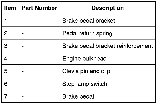 The brake pedal is mounted in a bracket attached to the rear side of the engine bulkhead. A clevis pin and clip connect the brake pedal to the push rod of the brake booster.