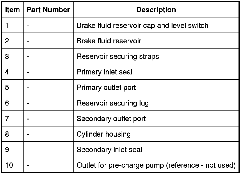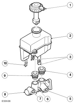 The brake fluid reservoir is located on top of the master cylinder assembly. The reservoir is internally divided to provide an independent supply of fluid to each brake circuit, and so prevent a single fluid leak from disabling both primary and secondary brake circuits. Should a failure occur in one circuit, the remaining circuit will still operate effectively, although brake pedal travel and vehicle braking distances will increase.