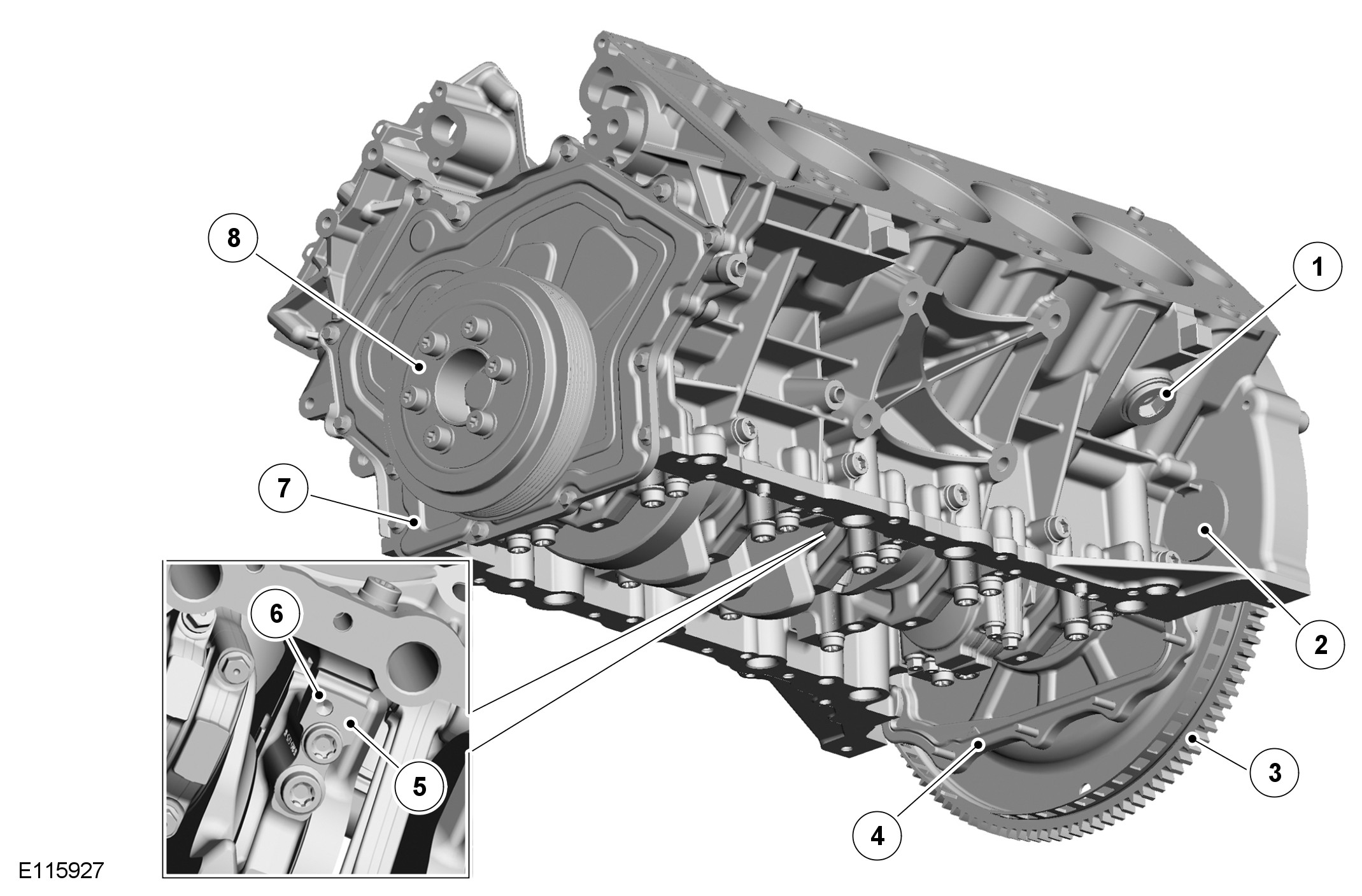 The main structural components of the engine are all manufactured from aluminum alloy. The engine is built around a very stiff, lightweight, enclosed V, deep skirt cylinder block. A structural windage tray is bolted to the bottom of the cylinder block to further improve the block stiffness, minimize NVH (noise, vibration and harshness) and help reduce oil foaming. To further enhance the stiffness of the lower engine structure, a heavily ribbed sump is installed. The sump also helps to reduce engine noise. A transverse hole is incorporated into the sump to accommodate the RH (right-hand) front drive halfshaft.