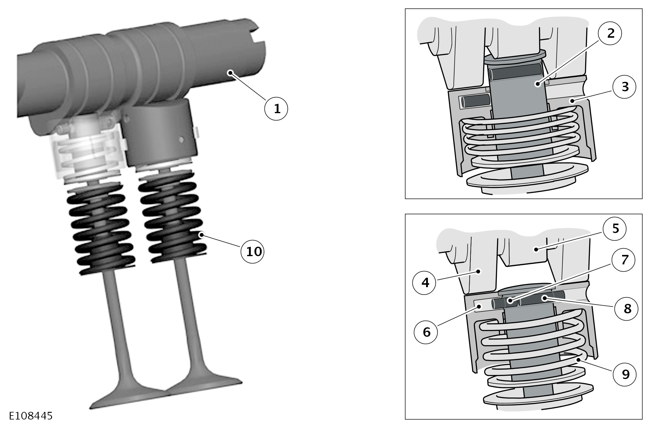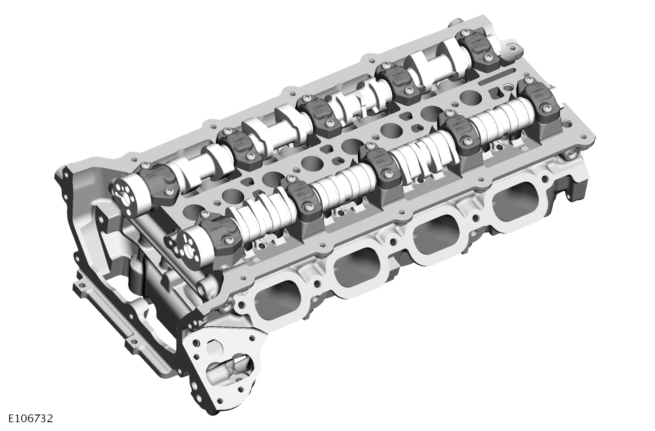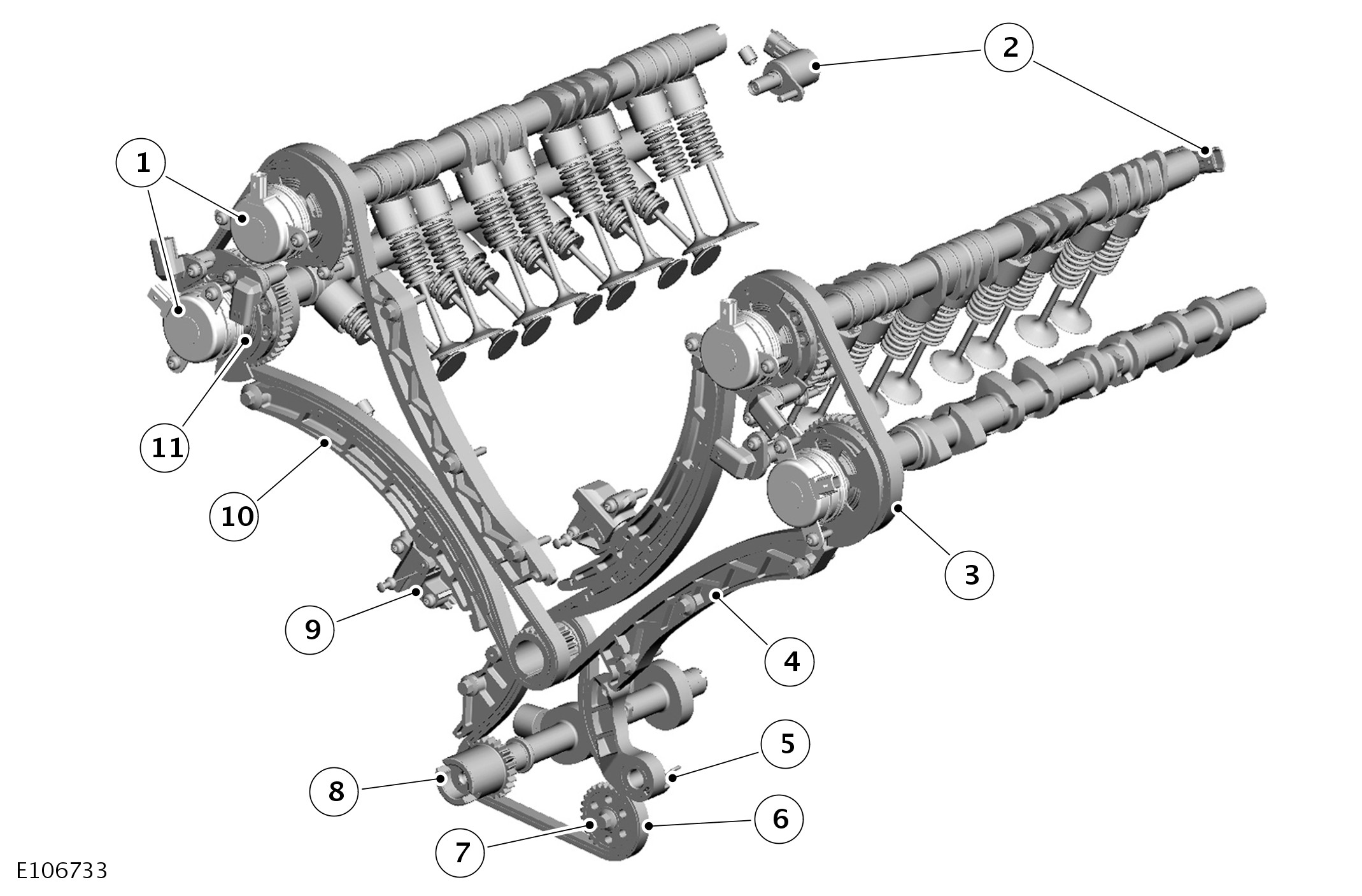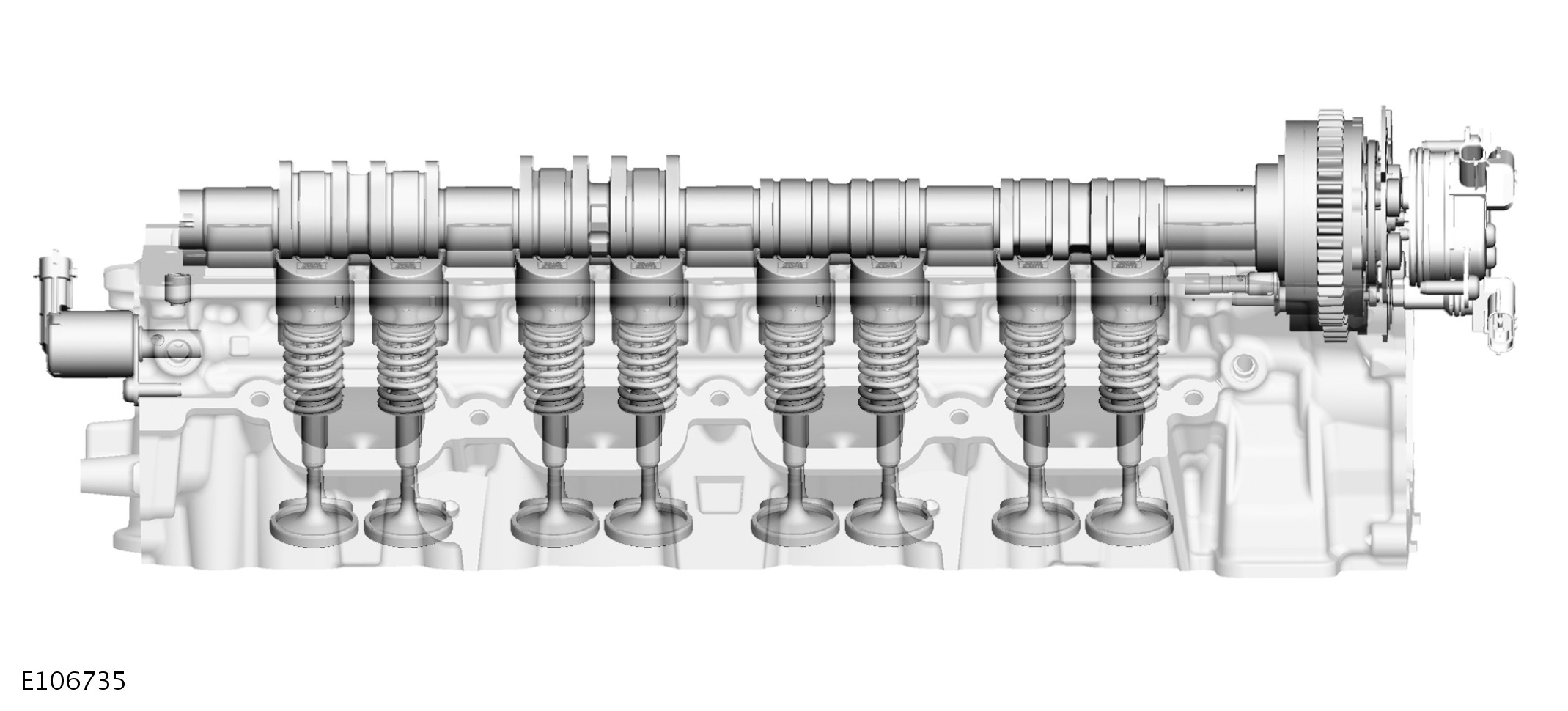 Double overhead camshafts on each cylinder head operate the valves. For each cylinder head, an inverted tooth timing chain transfers drive from the crankshaft to the VCT (variable camshaft timing) unit on the front of each camshaft. Graded tappets enable setting of exhaust valve clearances. Switchable tappets with hydraulic lash adjusters are installed on the intake valves.