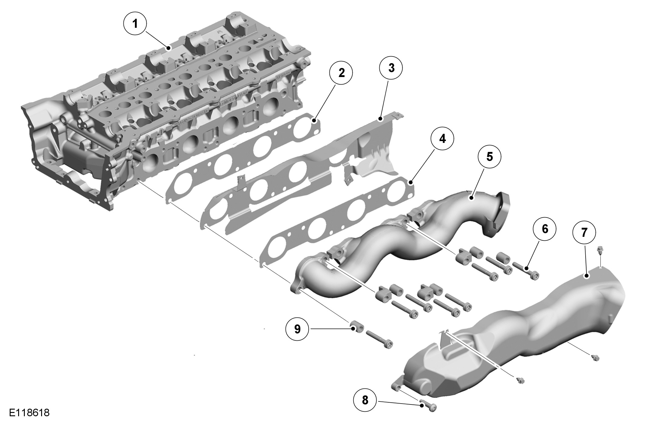 The high SiMo (silicon molybdenum) cast iron exhaust manifolds are unique for each cylinder bank. Each exhaust manifold installation includes two metal gaskets and two heat shields. Spacers on the securing bolts allow the manifolds to expand and contract with changes of temperature while maintaining the clamping loads.