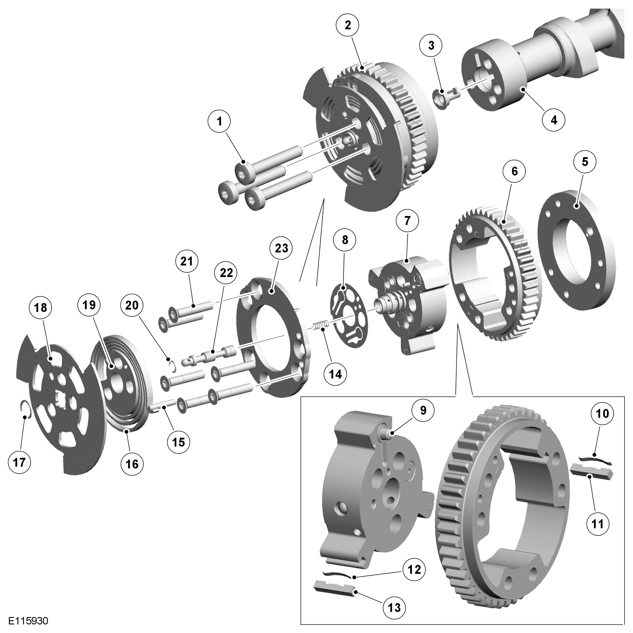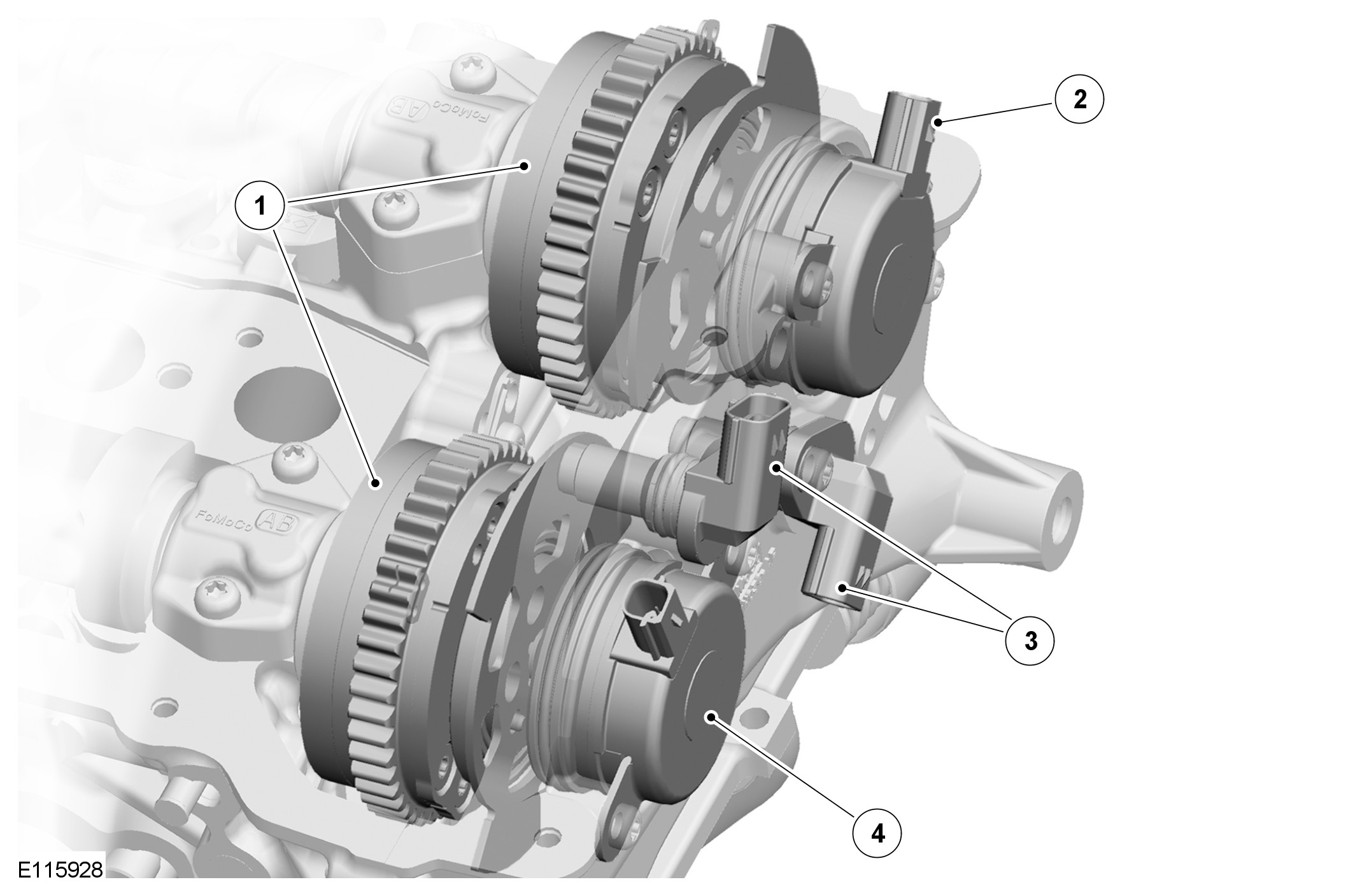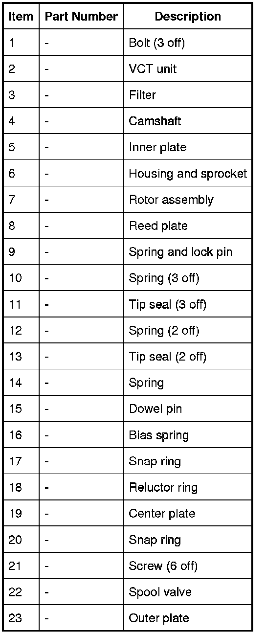 A reluctor ring, for the CMP (camshaft position) sensor, a center plate and a bias spring are installed at the front of the VCT (variable camshaft timing) unit. The ends of the bias spring locate on the center plate assembly and the sprocket housing, to give a turning moment to the camshaft in the advance direction. A snap ring locates the reluctor ring on to a sleeve installed in the center of the rotor assembly. The opposite end of the sleeve locates in a bore in the front face of the camshaft, which contains a filter.