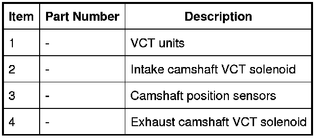 The system consists of a VCT (variable camshaft timing) unit and a VCT (variable camshaft timing) solenoid for each camshaft. The ECM (engine control module) controls the system using PWM (pulse width modulation) signals to the VCT (variable camshaft timing) solenoids.