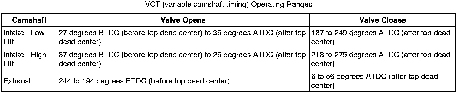 The VCT (variable camshaft timing) system varies the timing of the intake and exhaust camshafts to deliver optimum engine power, efficiency and emissions. The timing of the intake camshafts has a range of 62 degrees of crankshaft angle. The timing of the exhaust camshafts has a range of 50 degrees of crankshaft angle.