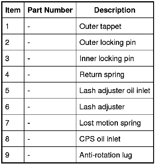 Each switchable tappet consists of inner and outer tappets, which can operate independently or be locked together by locking pins. A hydraulic lash adjuster on the bottom of the inner tappet locates on the intake valve stem.