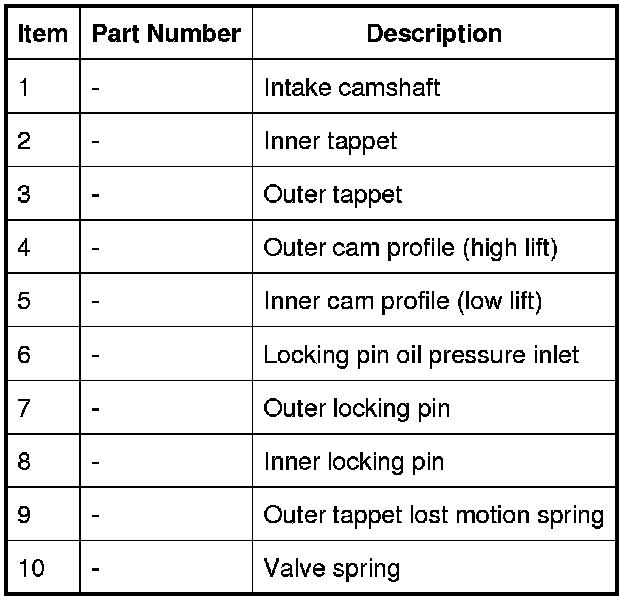 In high lift, engine oil is supplied to the locking pins, which lock the outer tappets to the inner tappets. Intake valve lift is controlled by the outer tappets, which run on the outer lobes of the intake camshafts. Movement of the outer tappets is transferred to the intake valves through the locking pins, the inner tappets and the hydraulic lash adjusters.