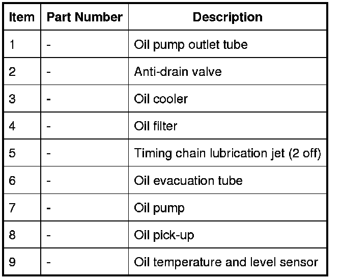 The output from the oil filter is distributed through oil galleries in the cylinder heads and cylinder block. All moving parts are lubricated by pressure or splash oil. Pressurized oil is also provided for the VCT (variable camshaft timing) system, the CPS system, the timing chain tensioners and the timing chain lubrication jets.