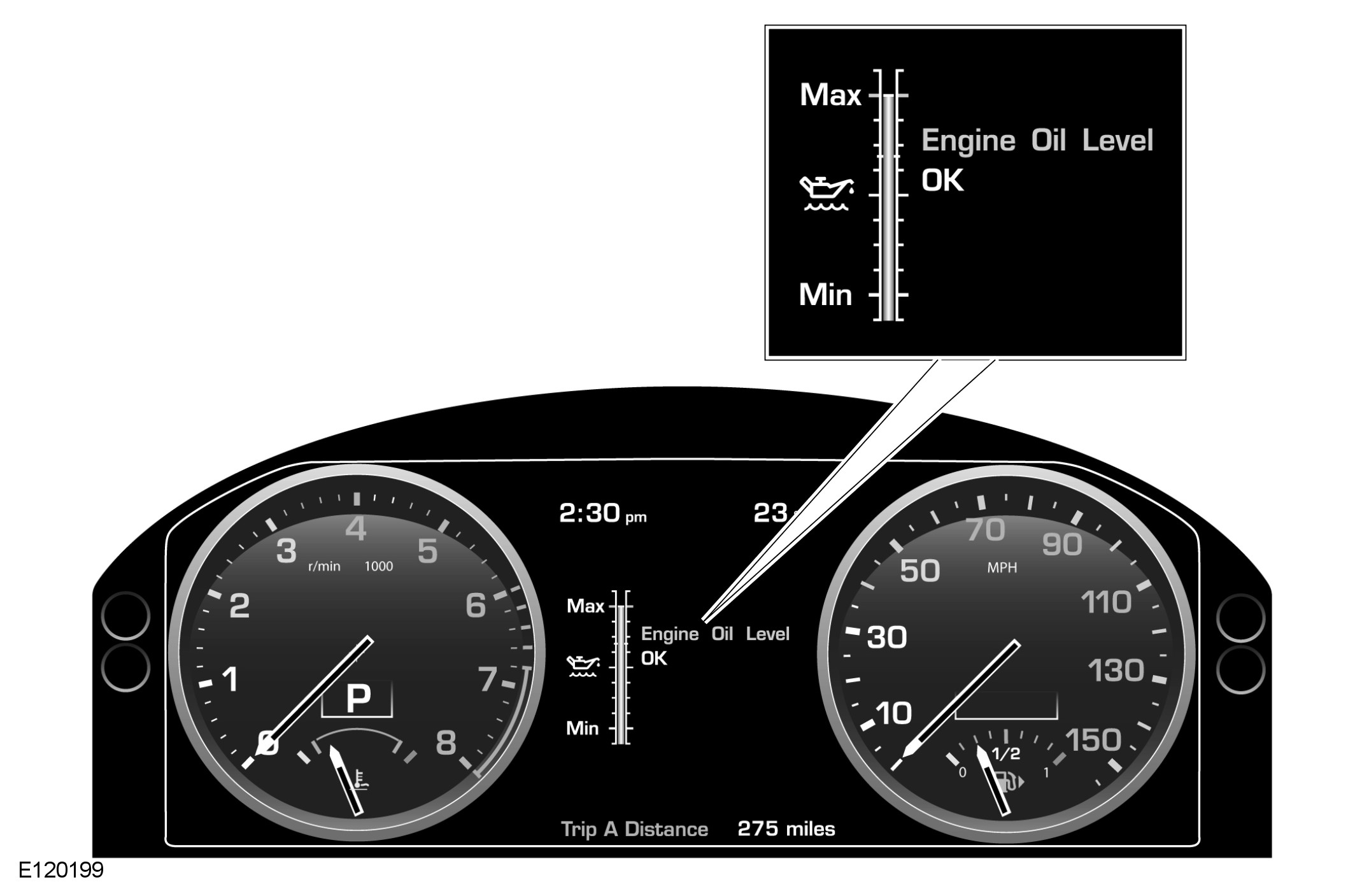 Oil level monitoring is provided by an oil level and temperature sensor that measures the oil level in the sump. The oil level can be displayed in the message center of the instrument cluster.