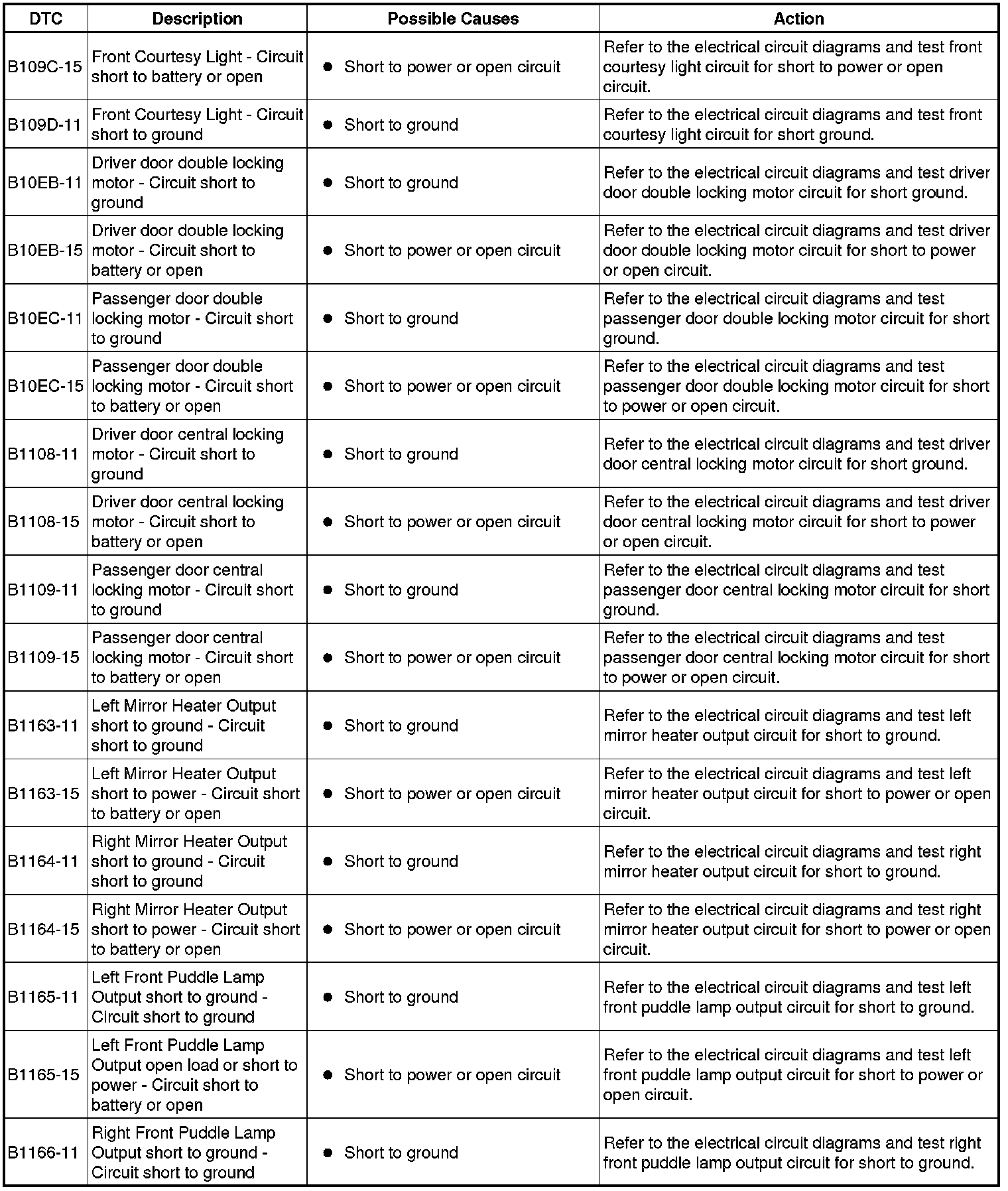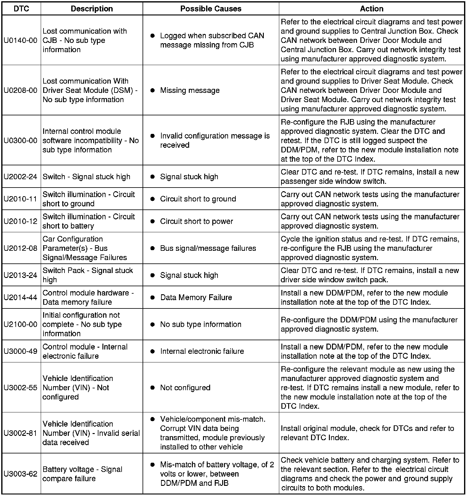 The table below lists all Diagnostic Trouble Codes (DTCs) that could be logged in the Driver Door Module, for additional Diagnosis and Testing information refer to the relevant Diagnosis and Testing Section.
